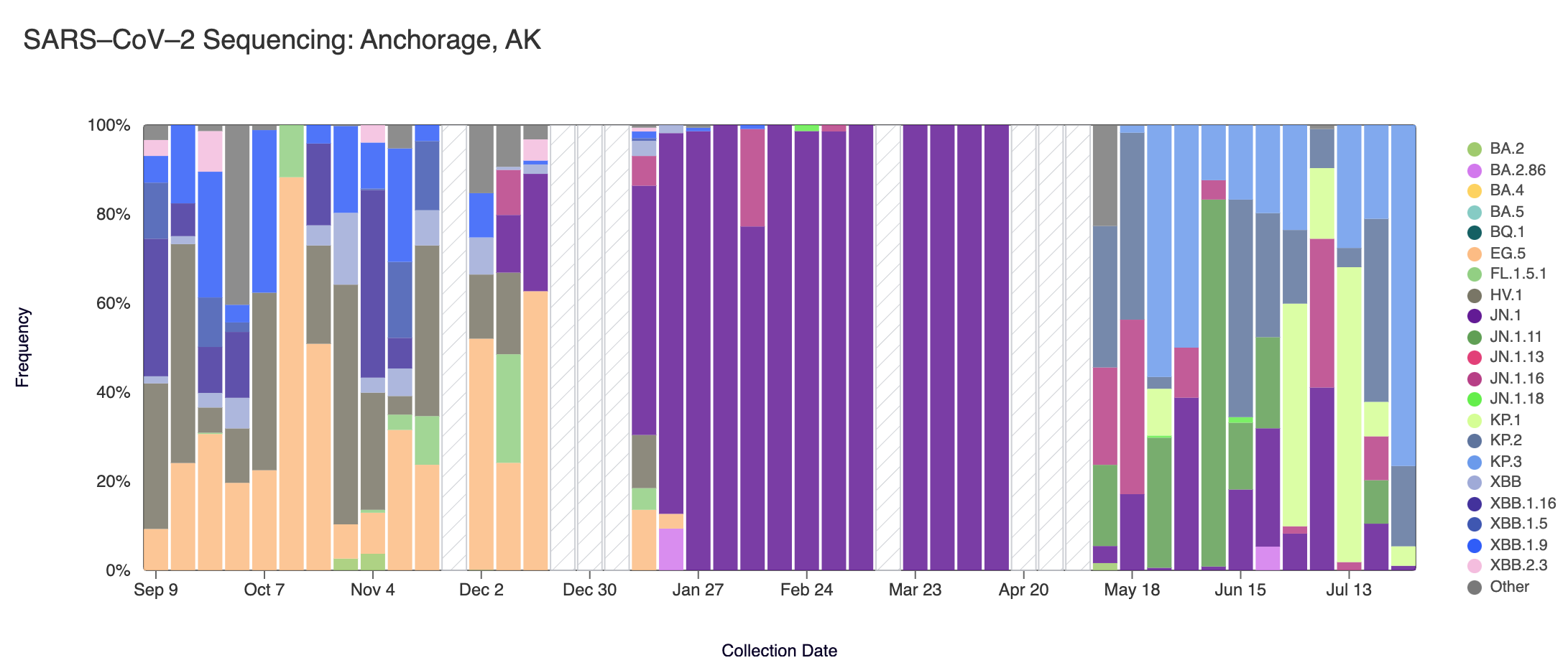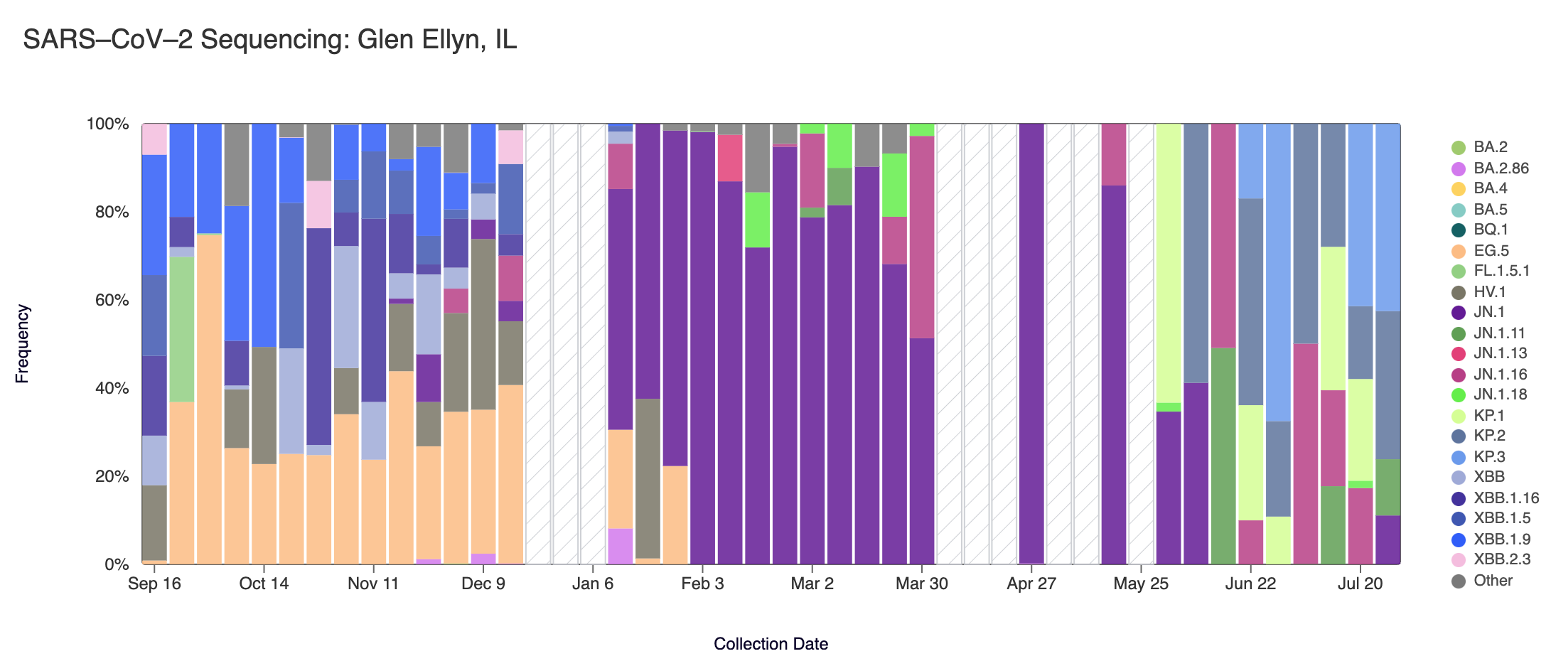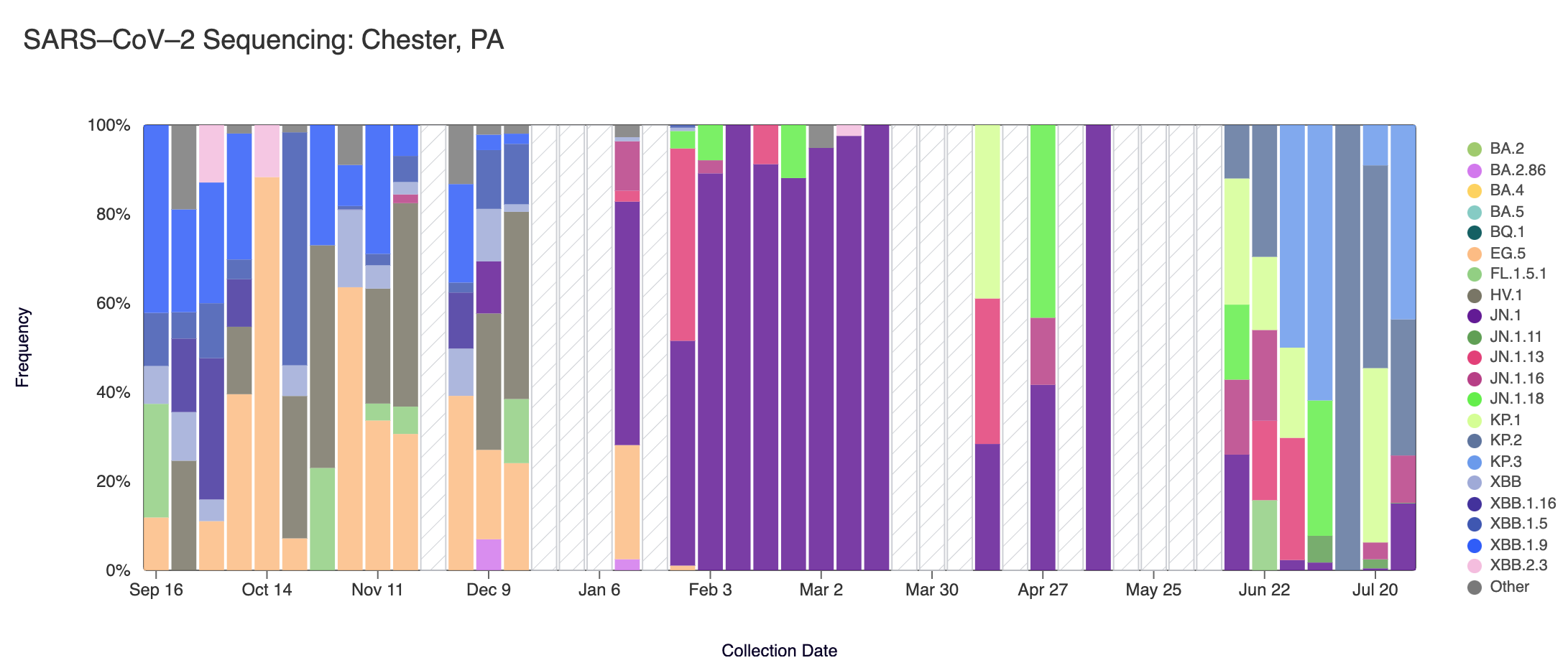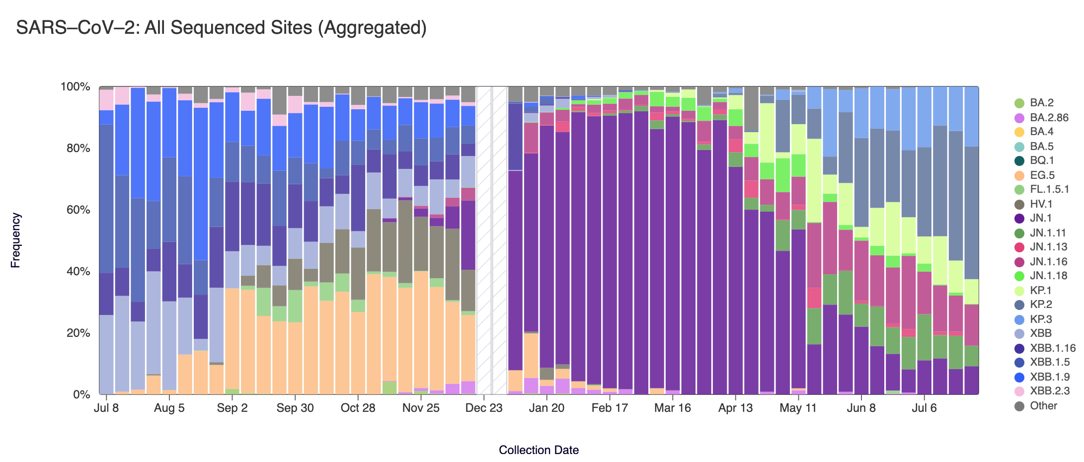 Sequencing data is also available in aggregate across all sites in WWSCAN with sequencing data. That plot is shown below and also suggests that KP.2 (shown in slate blue) is the most abundant variant across all sites (43.1%) followed by KP.3 (shown in light blue) (19.4%) and JN.1.1.16 (shown in pink) (13.3%).