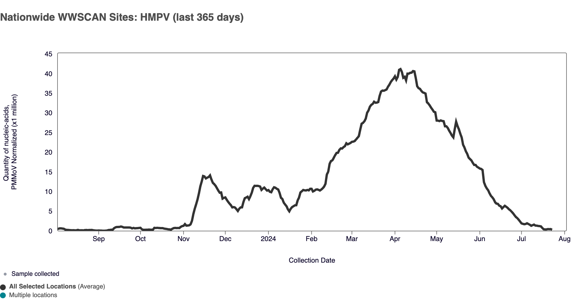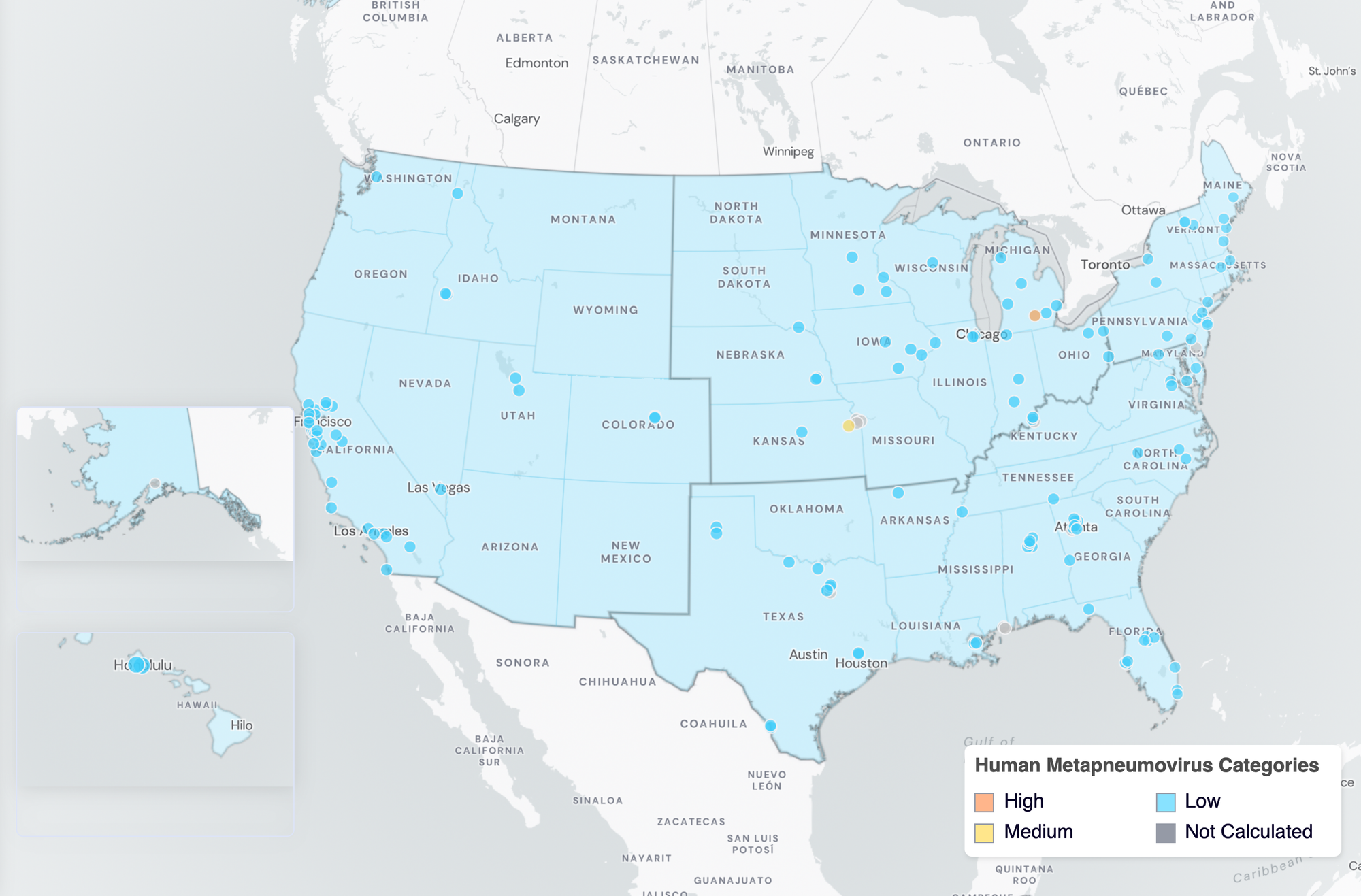 Nationally, HMPV is in the "LOW" Wastewater Category with <50% of sites showing onset of HMPV in wastewater.