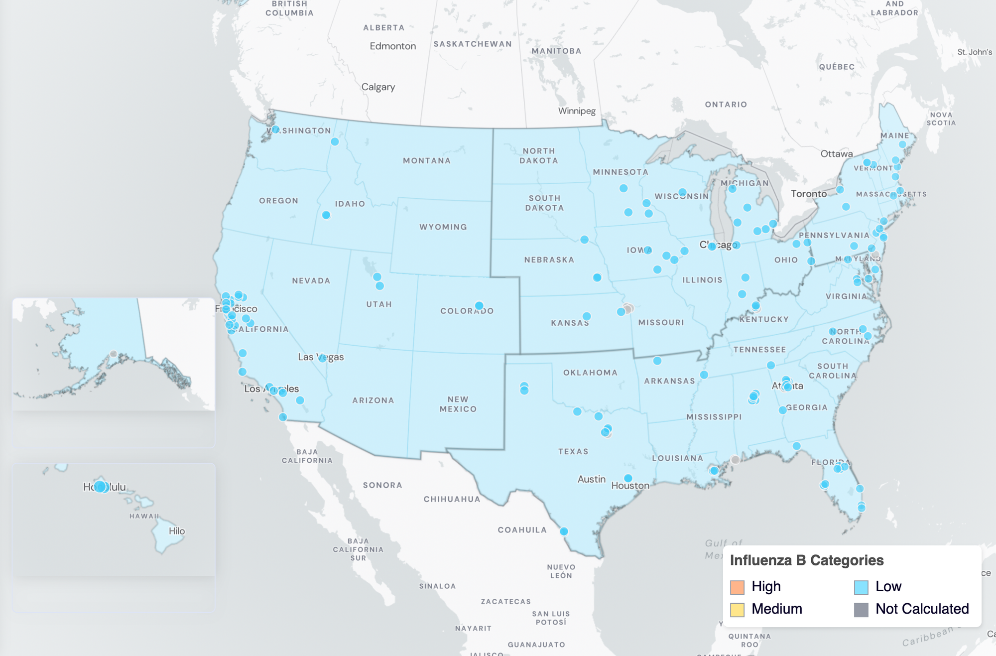 Nationally, Influenza B is in the "Low" Wastewater Category with <50% of sites showing onset of IBV in wastewater.
