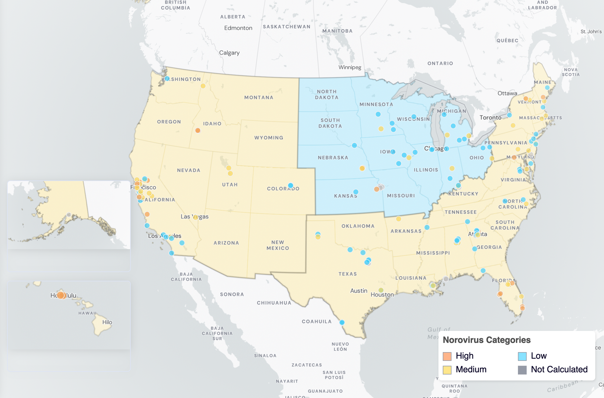 Below are the current Norovirus wastewater categories for all WWSCAN sites (recall the category is determined by both the trend and the level):