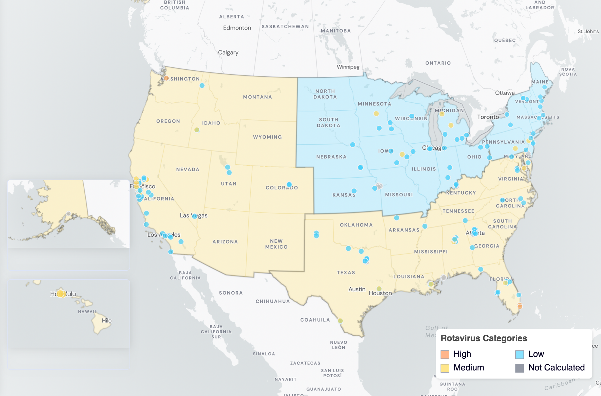 Rotavirus is in the "Medium" Wastewater Category nationally with aggregated measurements showing medium concentrations with a downward trend in the last 21 days.