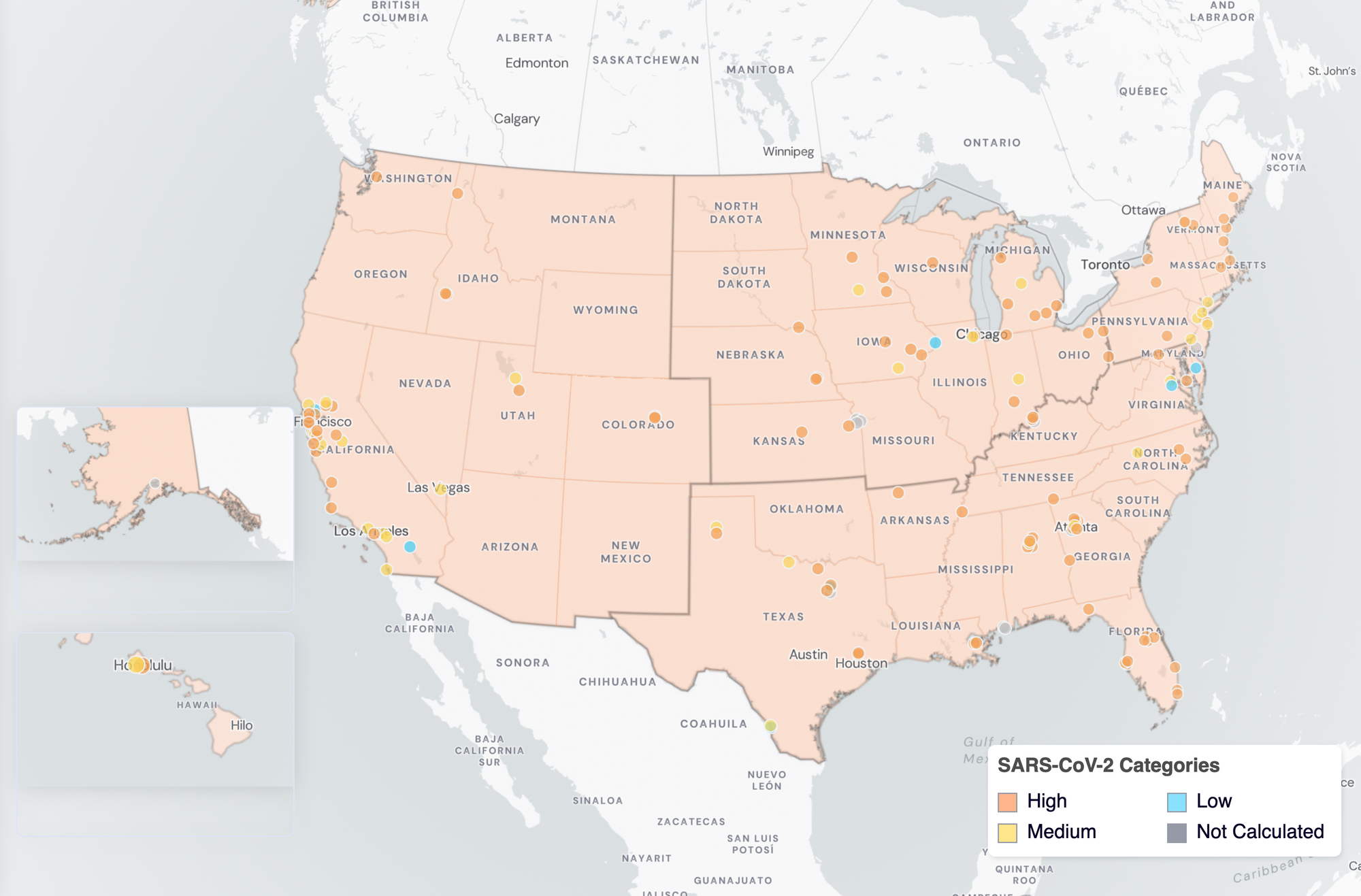 Nationally, SARS-CoV-2 is in the "High" category with aggregated measurements showing high concentrations and an upward over the past 21 days.