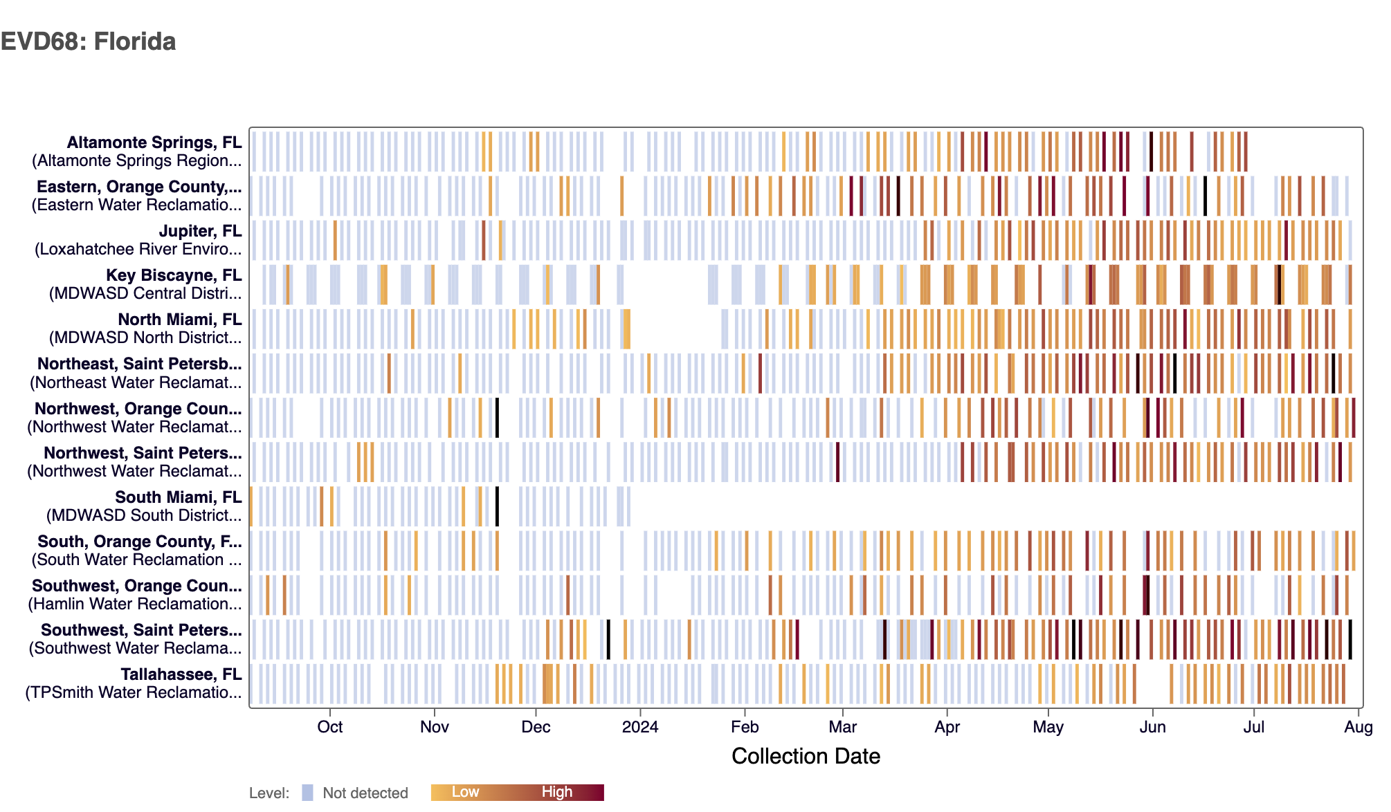 Enterovirus D68 (EV-D68) RNA was detected in ~37% of samples collected in July 2024 across WWSCAN sites and the median concentration across all sites was below the level of detection.