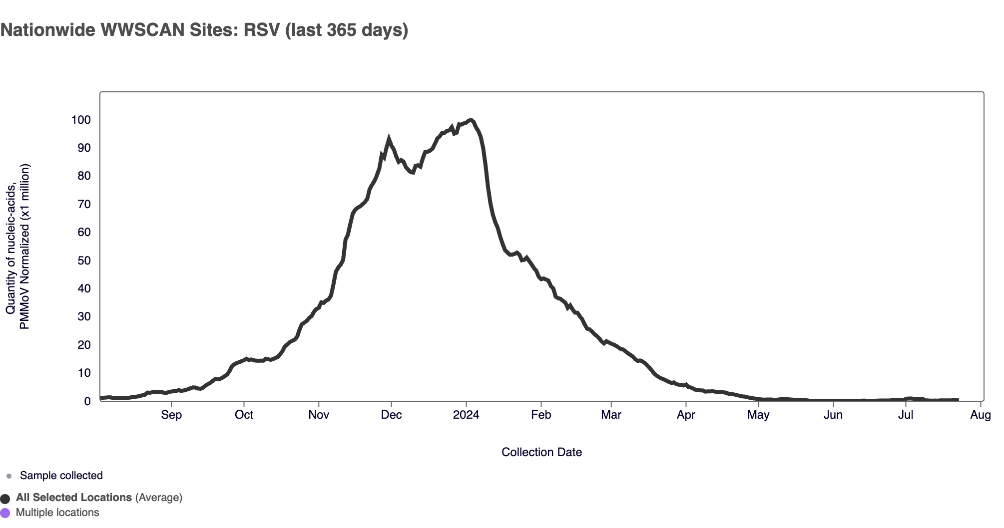 Respiratory syncytial virus (RSV) RSV RNA median concentration across all sites in July 2024 was below the limit of detection. Below are the RSV RNA concentrations (normalized by PMMoV) from all participating WWSCAN sites across the country over the last 365 days shown as the population-weighted average.