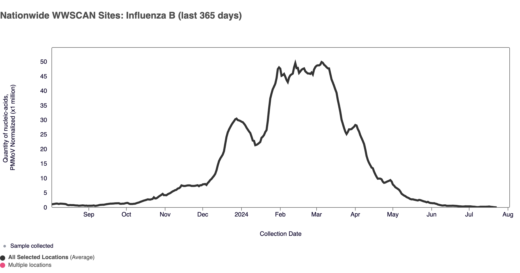 Influenza B (IBV) RNA was detected in ~7% of samples in July 2024. IBV RNA median concentration across all sites in July 2024 was below the limit of detection. Below is the population-weighted average IBV RNA concentrations (normalized by PMMoV) from all participating WWSCAN sites across the country over the last 365 days.