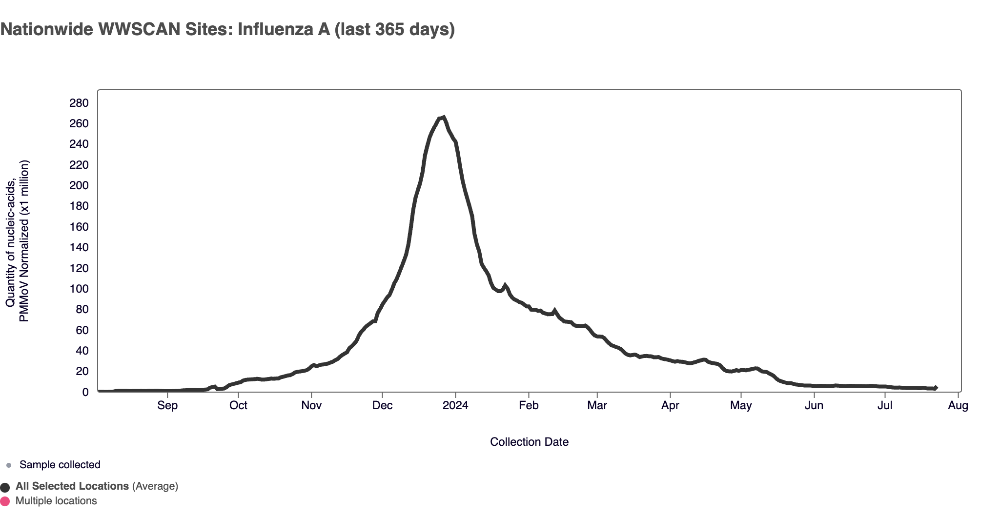 Influenza A (IAV) RNA median concentration across all sites July 2024 was below the limit of detection. For reference, the median concentration in June 2024 was below the limit of detection as well. Below is the population weighted average IAV concentrations (normalized by PMMoV) from all participating WWSCAN sites across the country over the last 365 days.