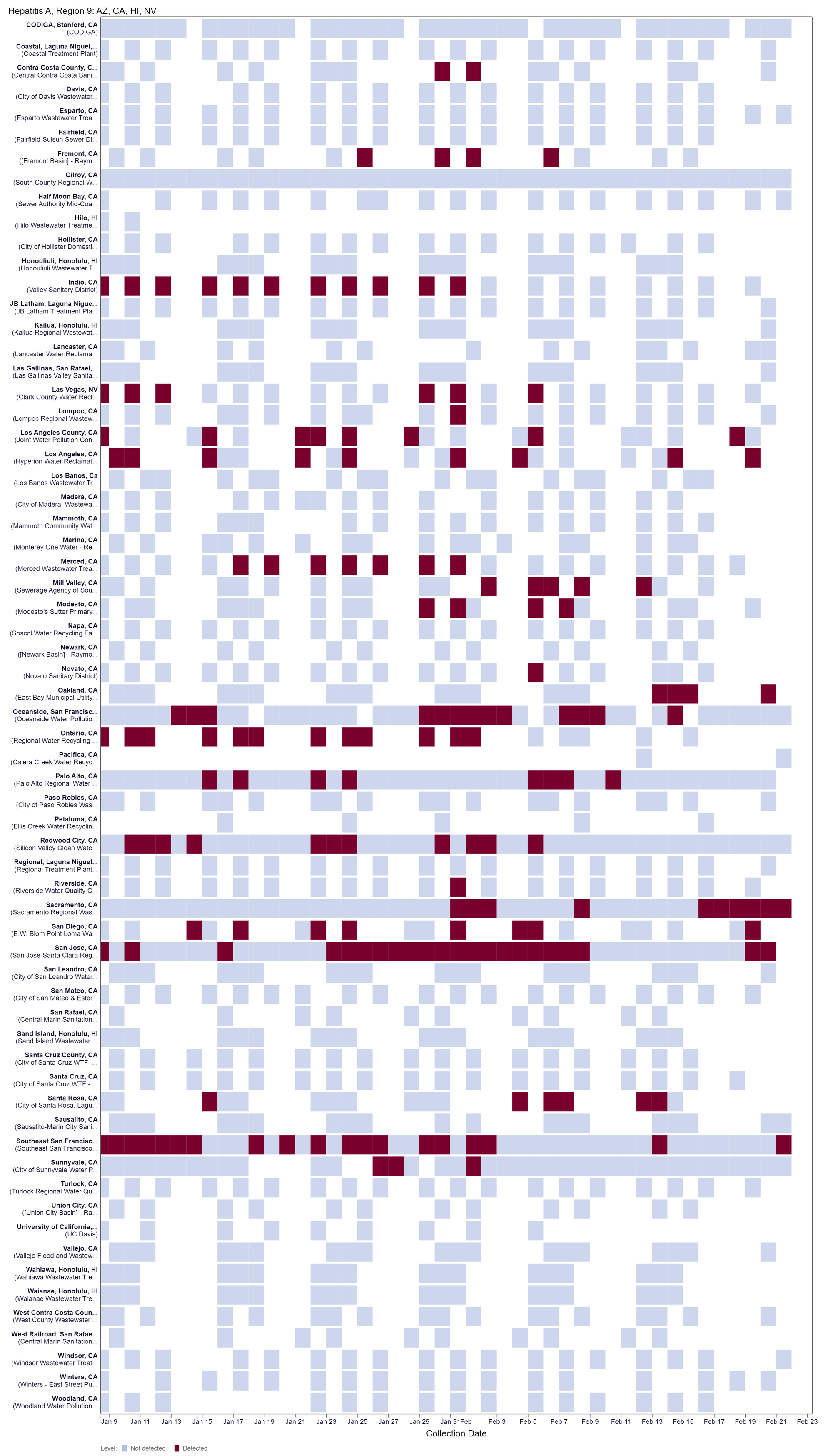 Hepatitis A (Hep A) RNA - We have detected Hep A RNA in 10.4% of samples from all WWSCAN sites over the past three weeks. The chart below shows each WWSCAN plant in HHS Region 9 as rows, and the last 21 days as columns (labeled at the bottom axis). White indicates no samples, blue is a non-detect for Hep A RNA and red is a detect for Hep A RNA.