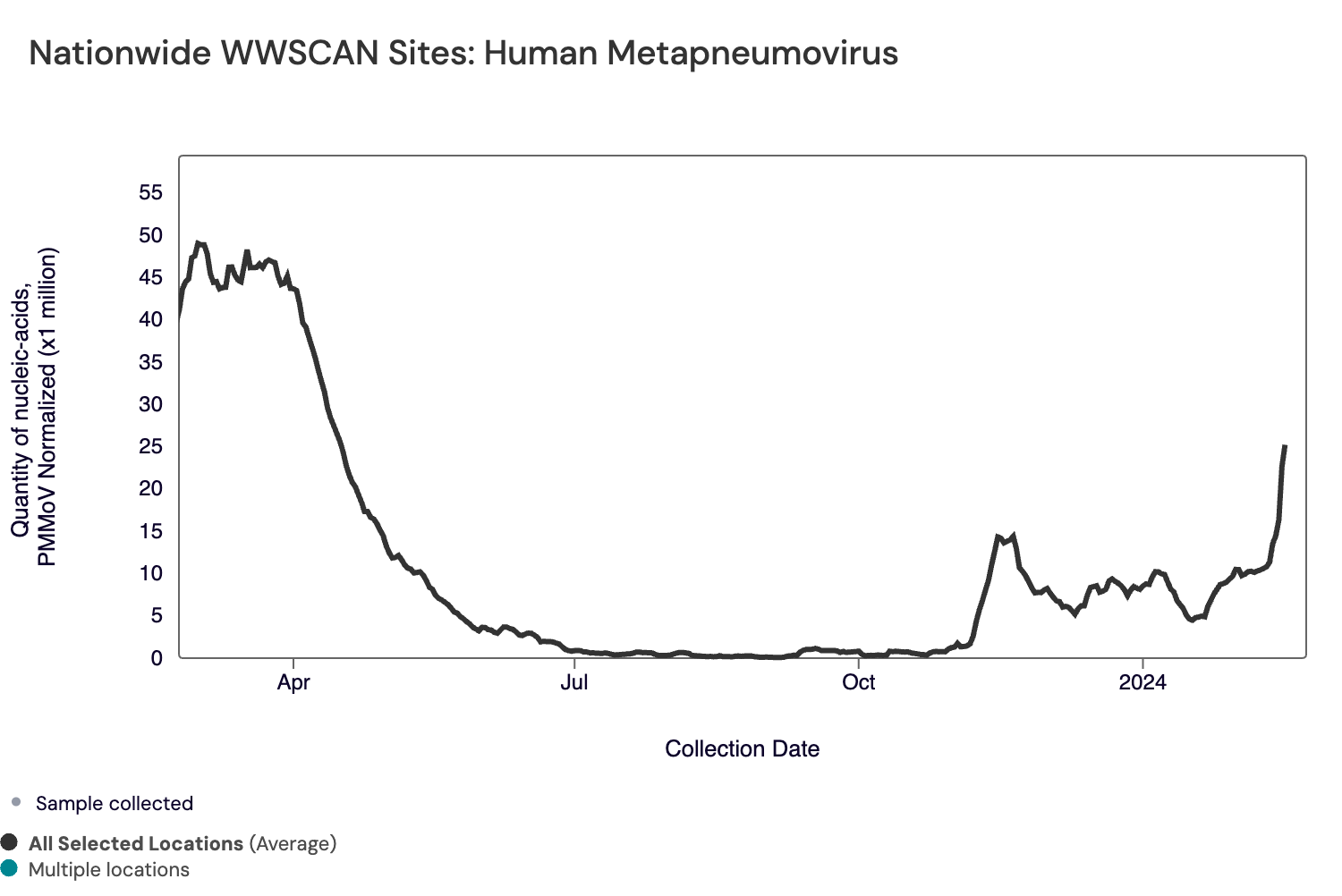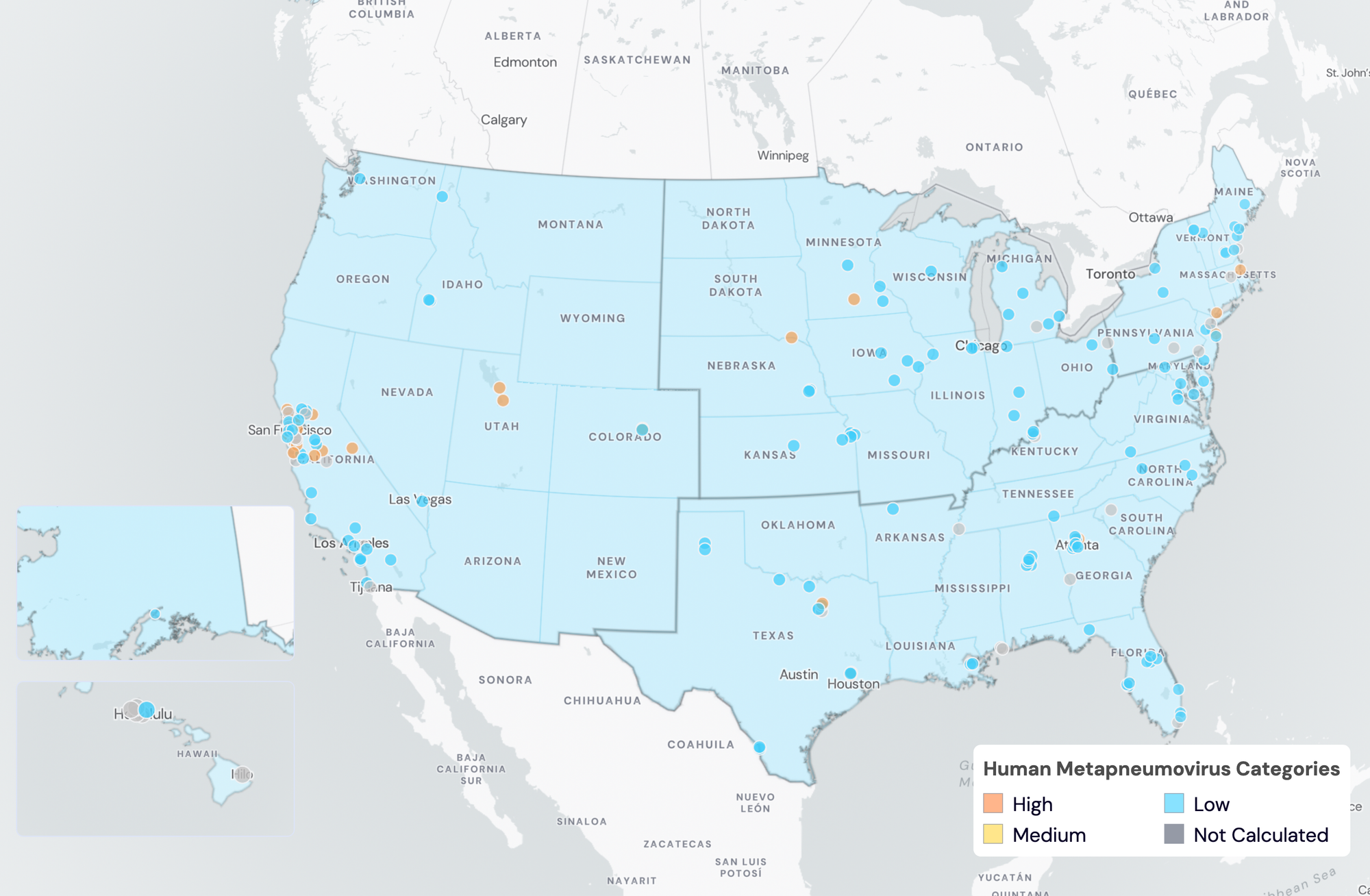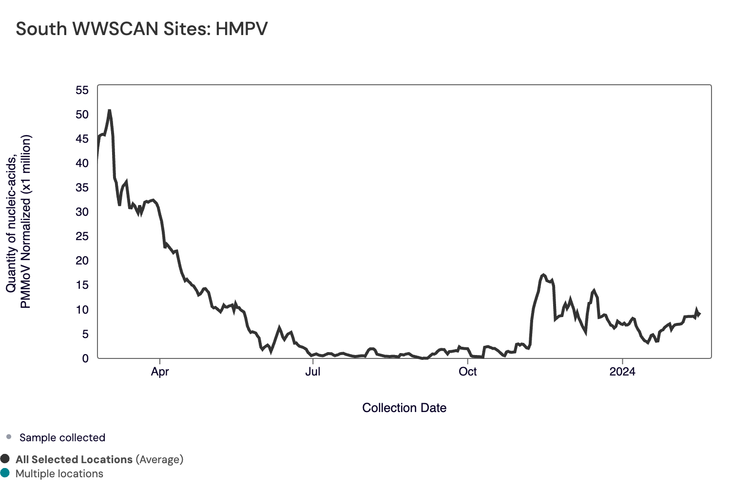 Nationally, HMPV is in the "Low" category. Concentrations are lower compared to around this time last year, but are starting to show a slight increase.
