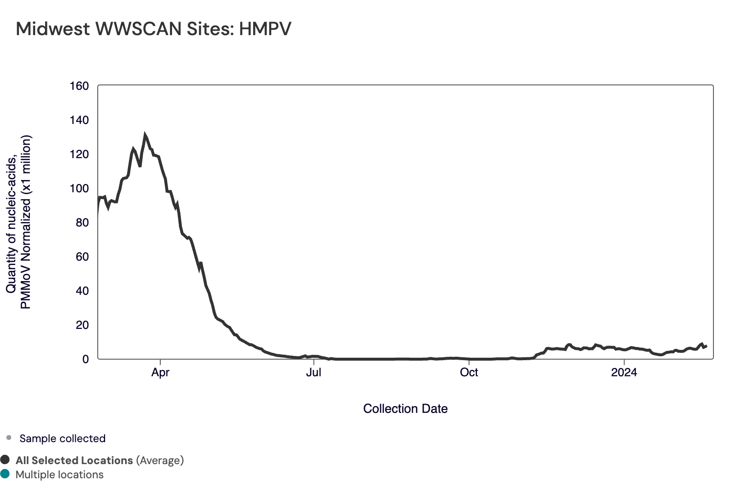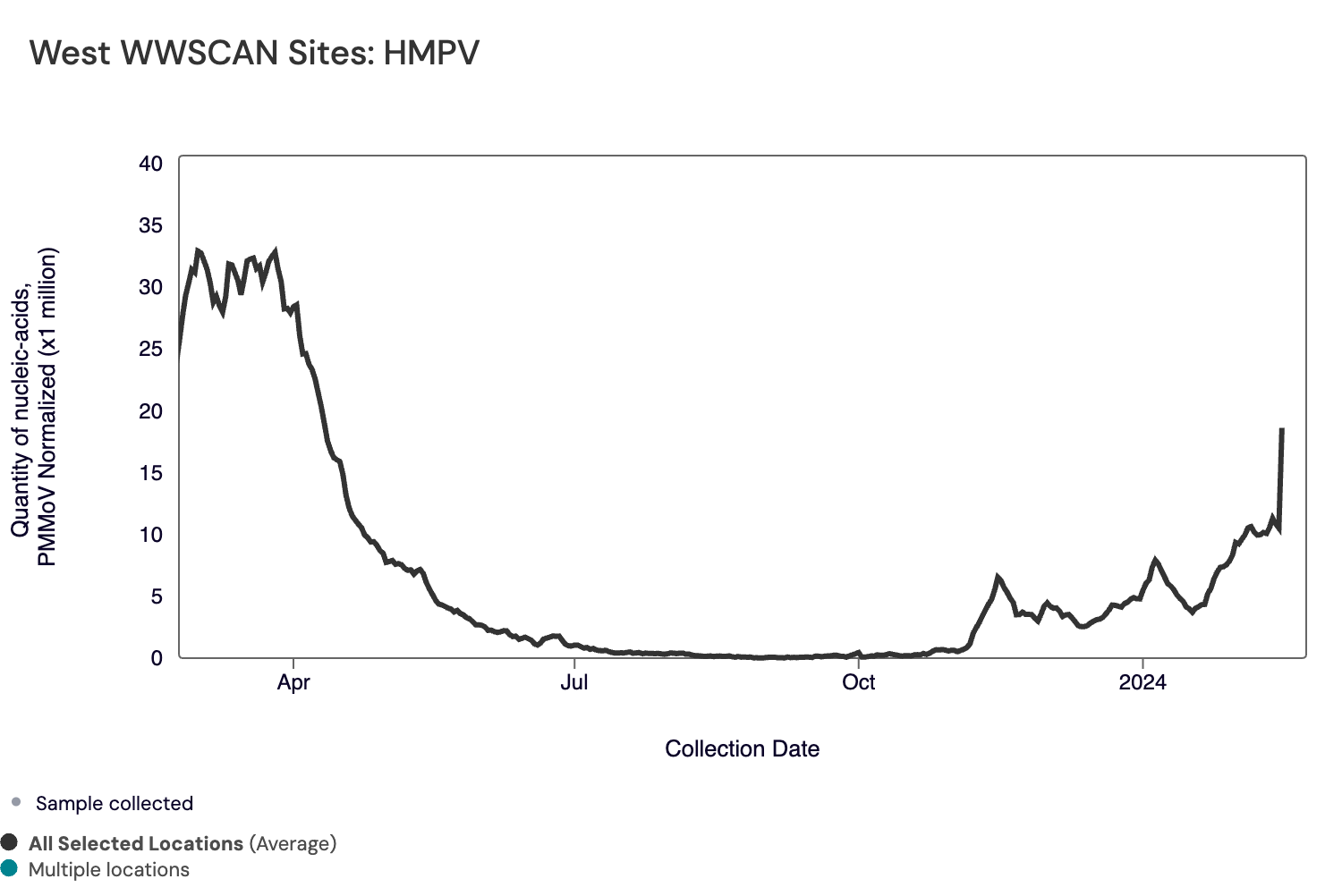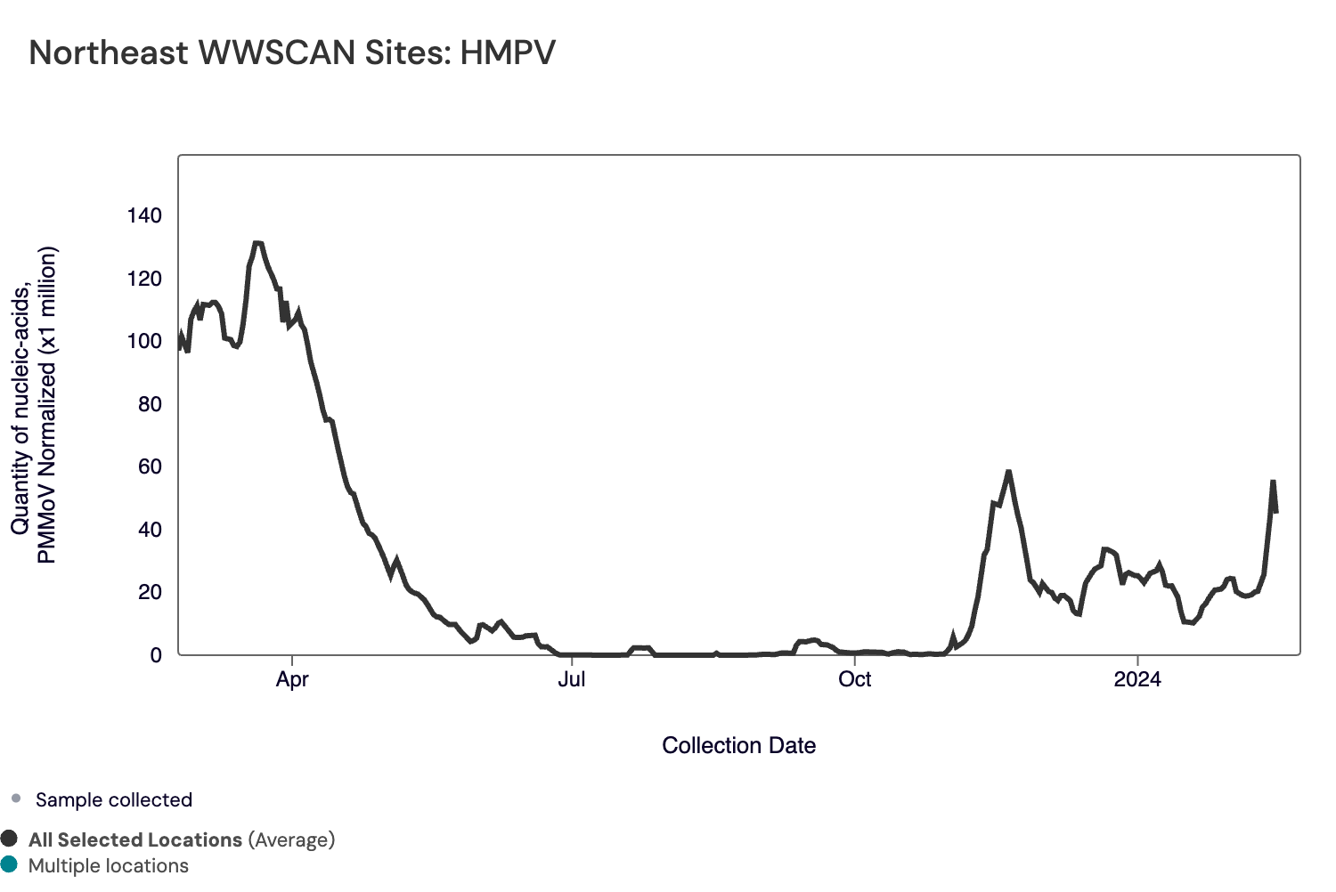 Nationally, HMPV is in the "Low" category. Concentrations are lower compared to around this time last year, but are starting to show a slight increase.