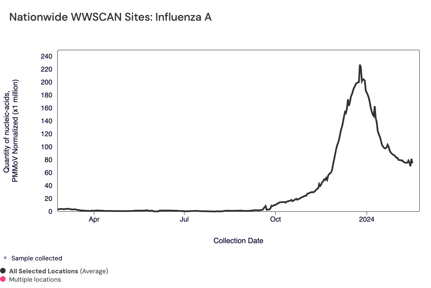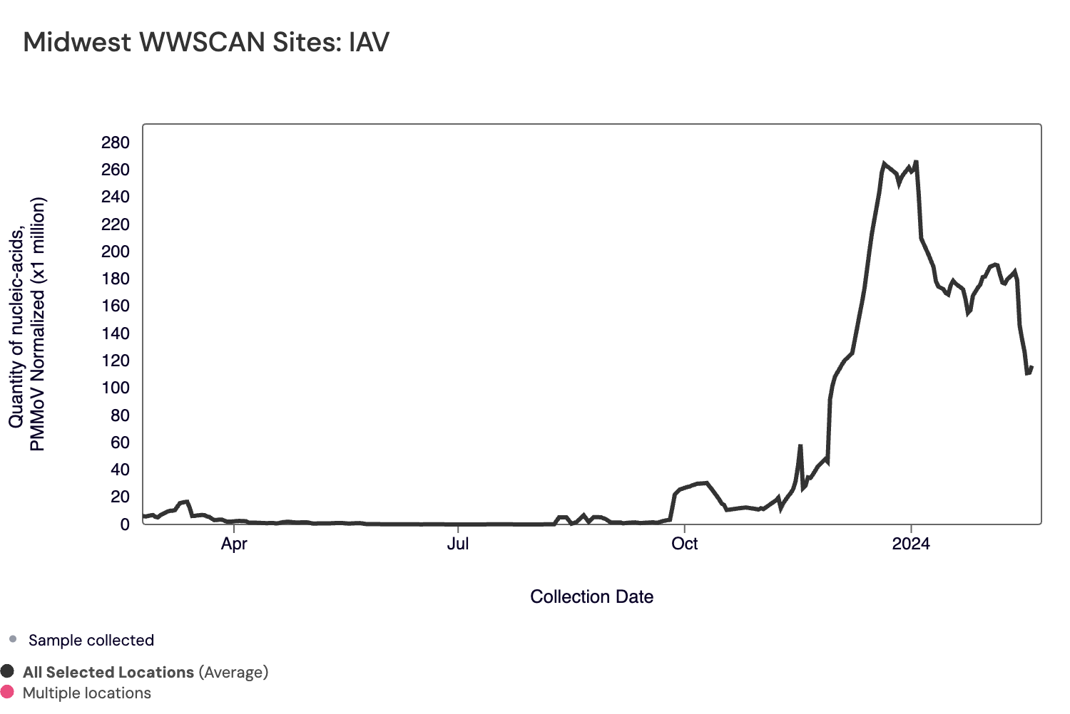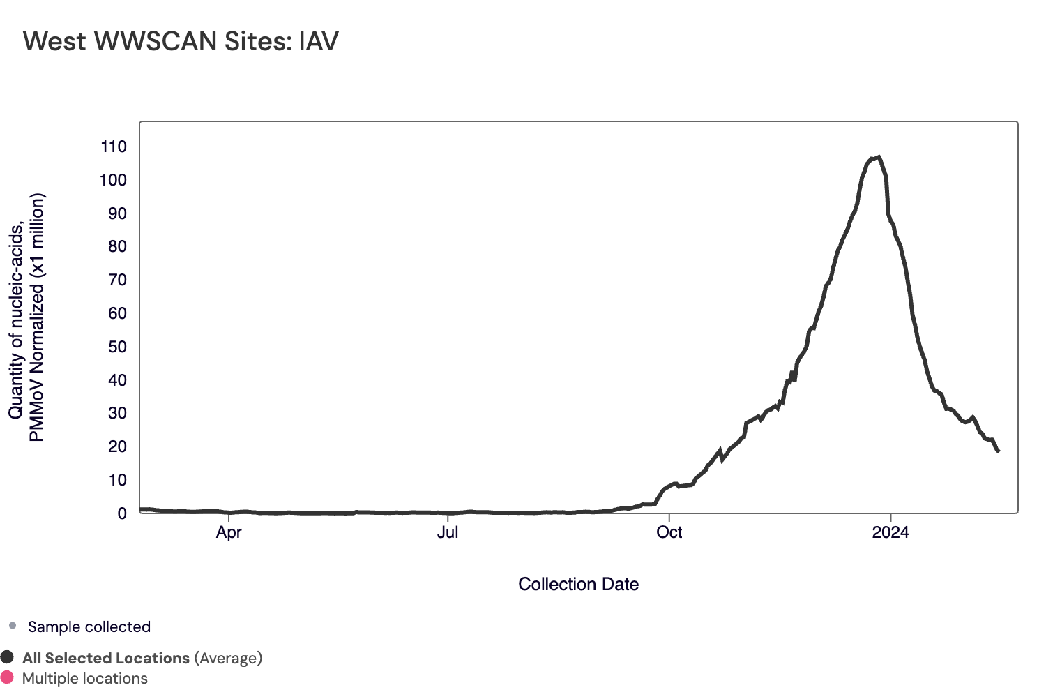 Influenza A (IAV) RNA A couple of weeks ago, we identified a technical issue with the IAV assay. All of the impacted data (1 Oct 2023 to approximately 11 Jan 2024) were removed from the website. We are now analyzing samples for IAV RNA using a probe containing a different, better performing fluorescent molecule. We have retrospectively rerun a subset of samples between 1 Oct 2023 and early Jan 2024 and have added those results to the site.