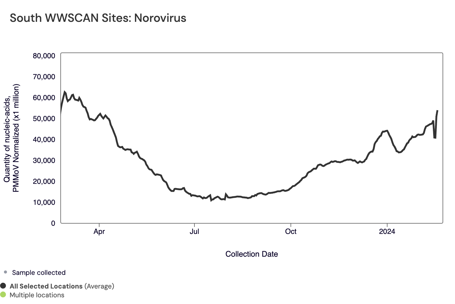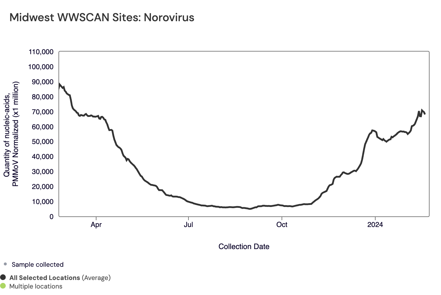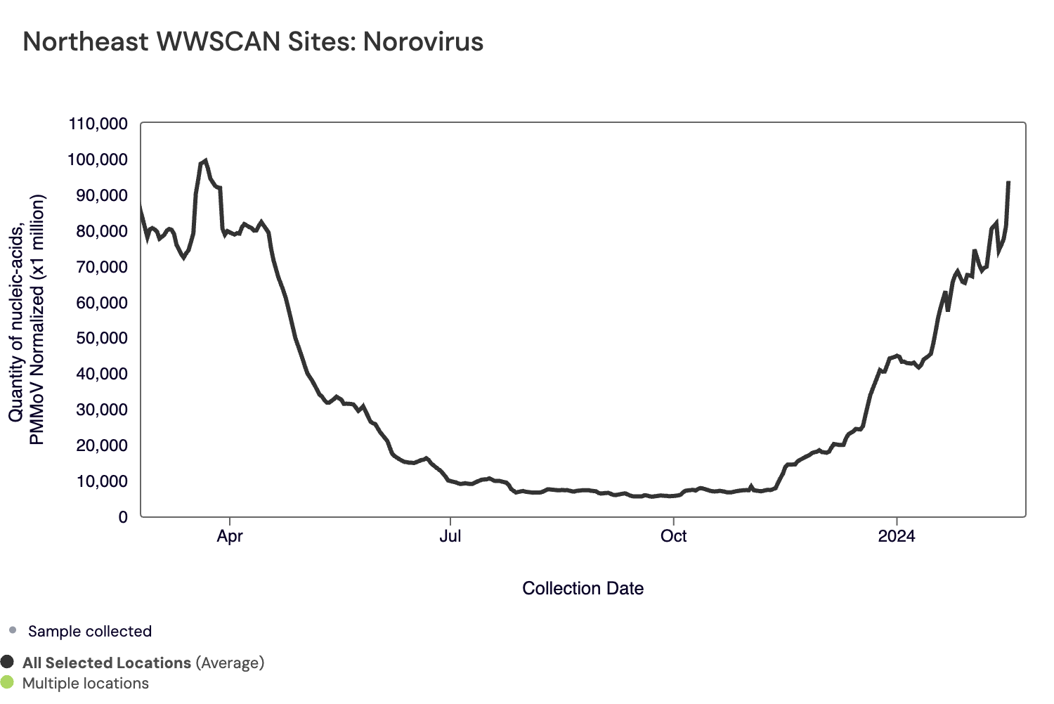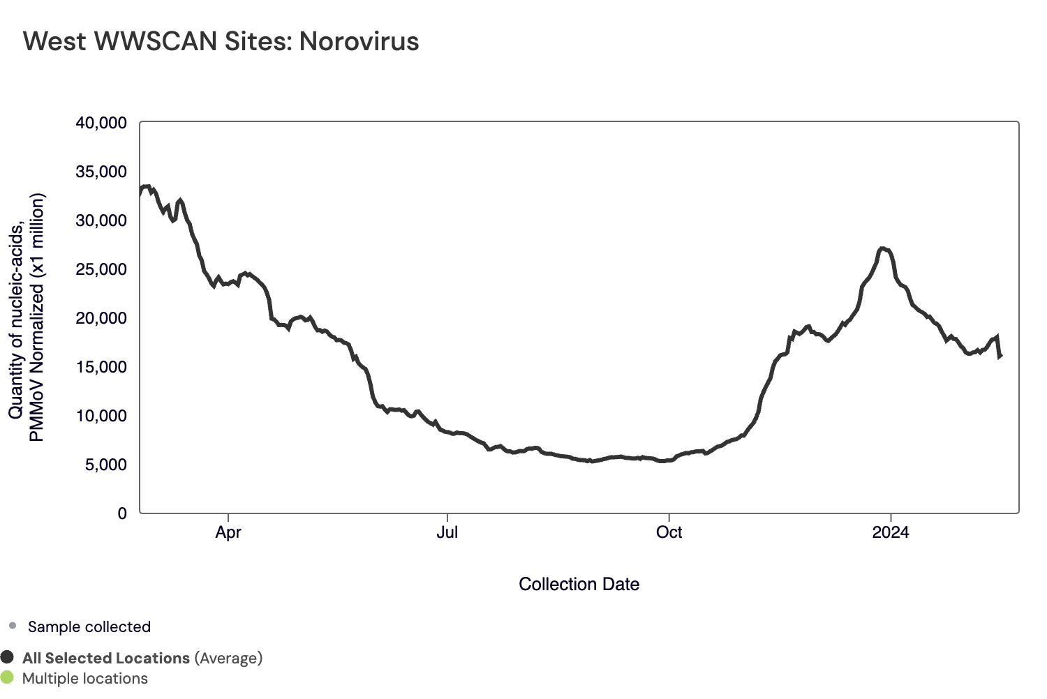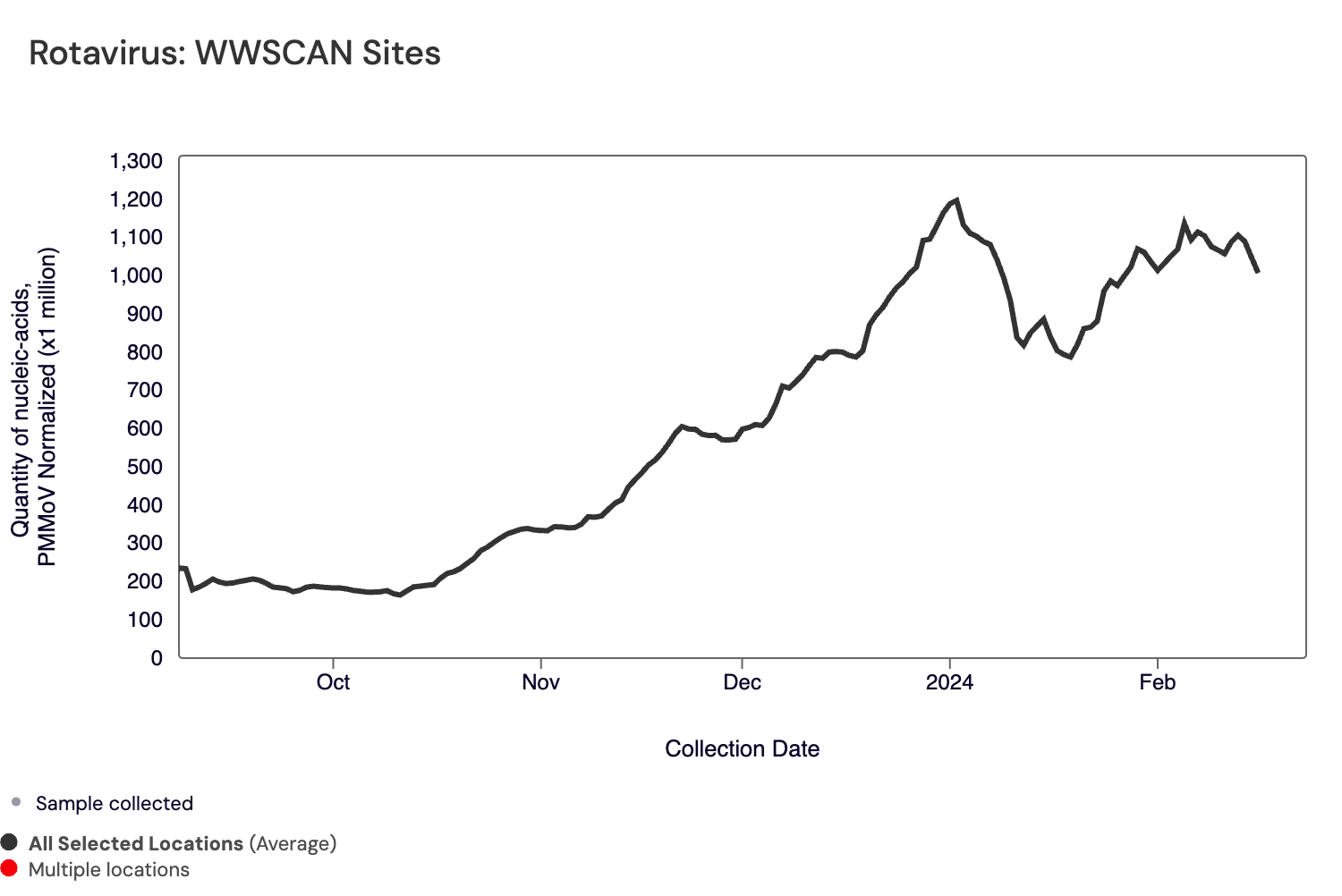 Rotavirus RNA concentrations are shown in the chart below; all the WWSCAN plants are shown together as a population-weighted average line. Rotavirus median concentrations across all sites over the last 21 days is 160,755 copies/gram. For reference, the median concentration in January 2024 was 124,606 copies/gram. You can interact with the chart of all the plants here. Levels in early 2024 are higher than fall 2023, when monitoring began. As we collect more data, we will be better able to interpret trends and levels of this pathogen.
