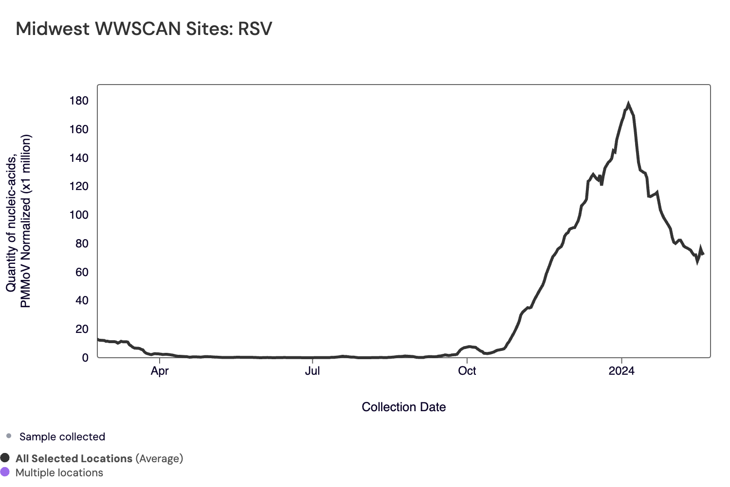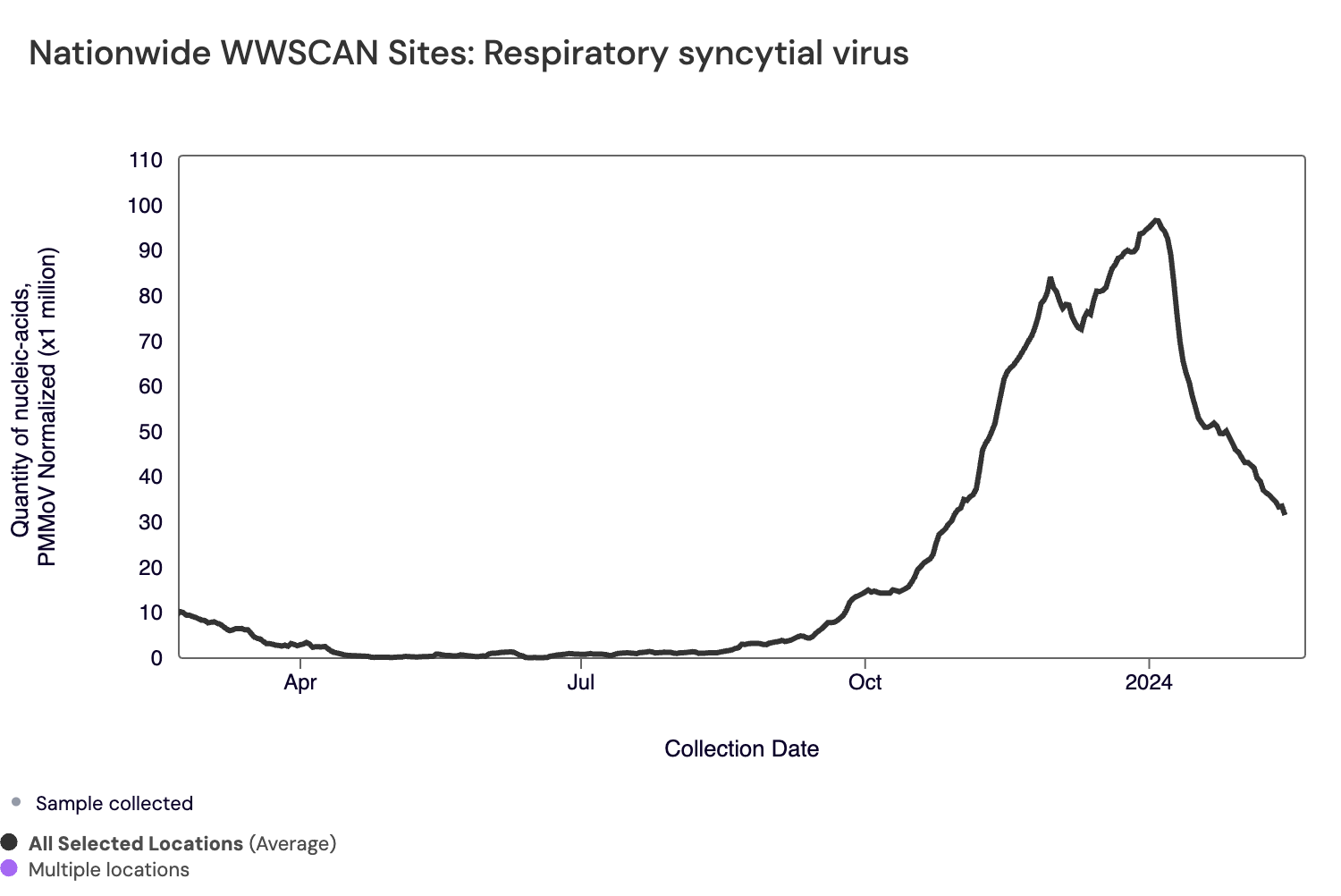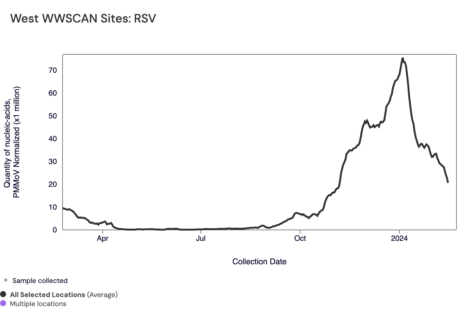 Respiratory syncytial virus (RSV) RSV RNA median concentration across all sites over the last 21 days is 10,839 copies/gram. For reference, the median concentration in January 2024 was 20,013 copies/gram. There have been 1,091 positive samples out of 1,334 samples during the past 21 days (~81% detection rate). Below are the RSV RNA concentrations (normalized by PMMoV) from all participating WWSCAN sites across the country over the last 365 days shown as the population-weighted average.