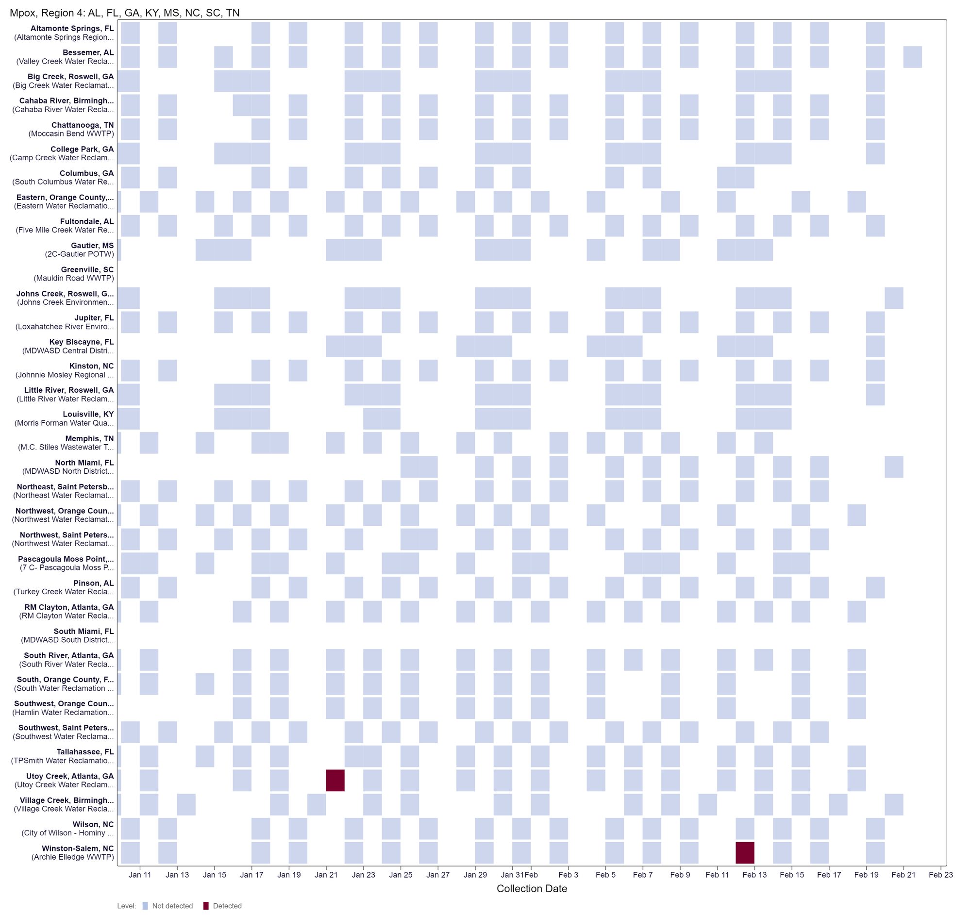 Mpox DNA We have only detected mpox DNA in 4 samples from all sites in the past 21 days. The chart below plants in HHS region 4 as rows, and the last 21 days as columns (labeled at the bottom axis). White indicates no samples, blue is non-detect for mpox DNA and red is detect for mpox DNA.