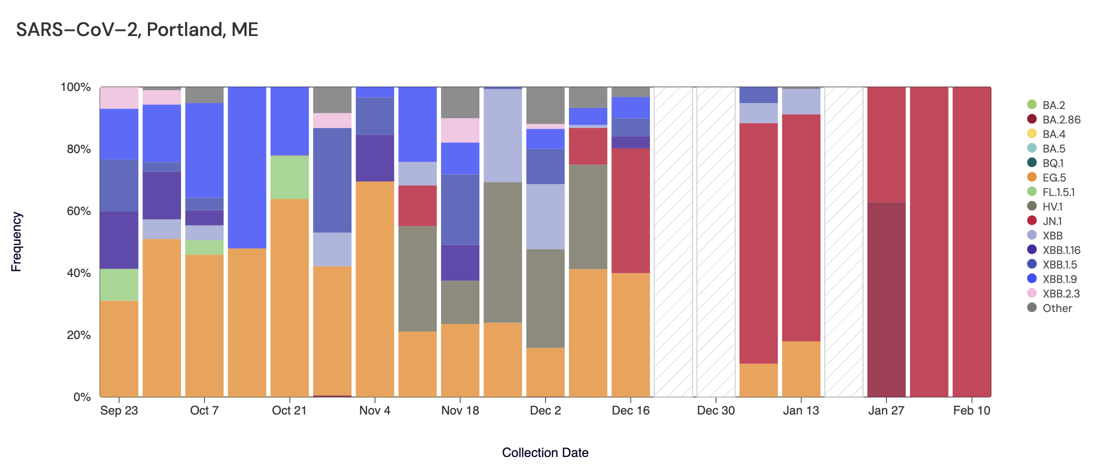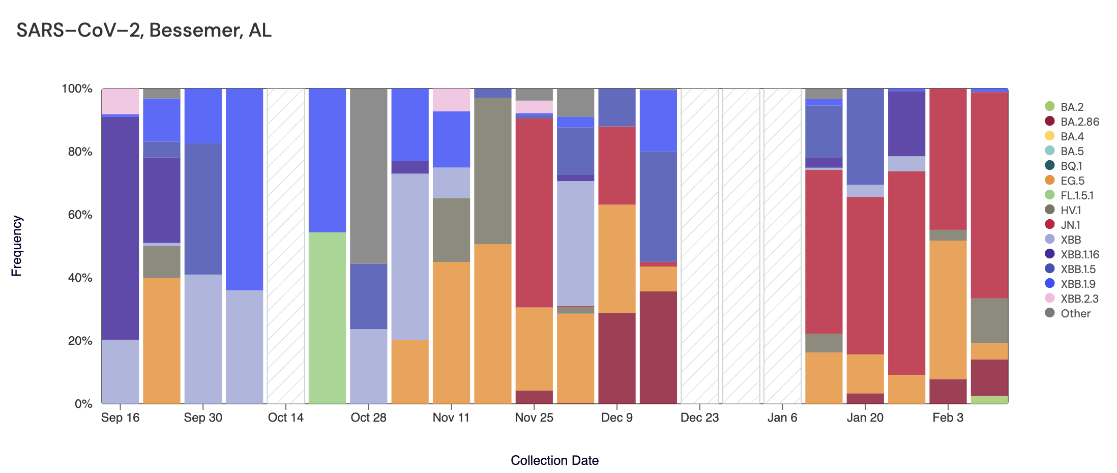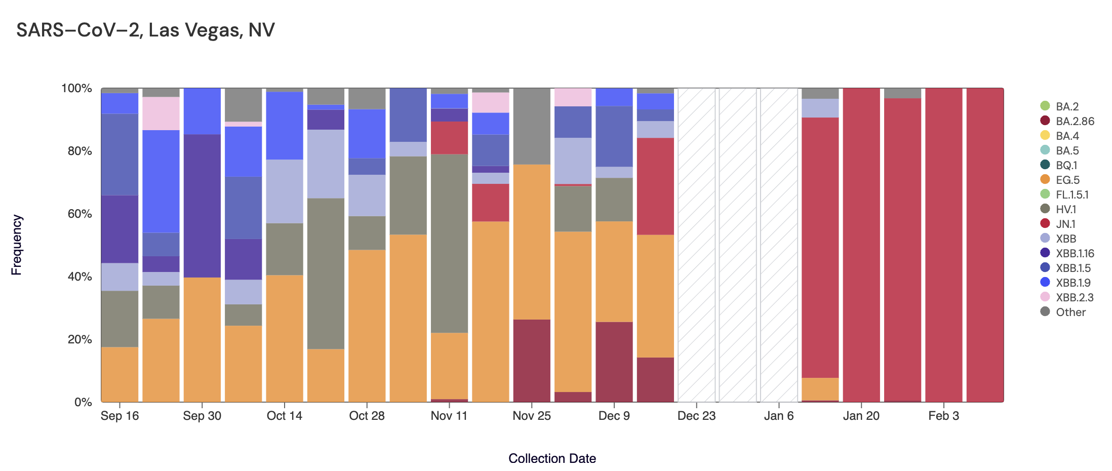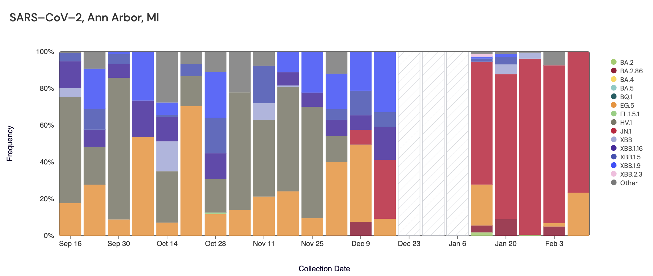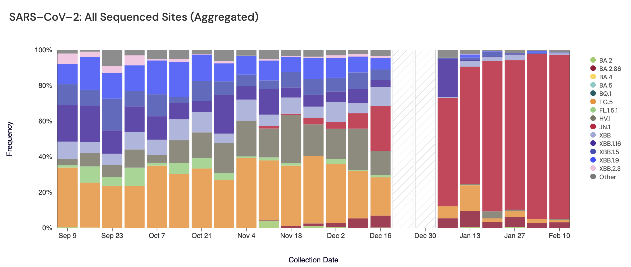 Sequencing data is also available in aggregate across all sites in WWSCAN with sequencing data. That plot is shown below and also suggests that JN.1 is the most abundant variant across all sites (92.3%).