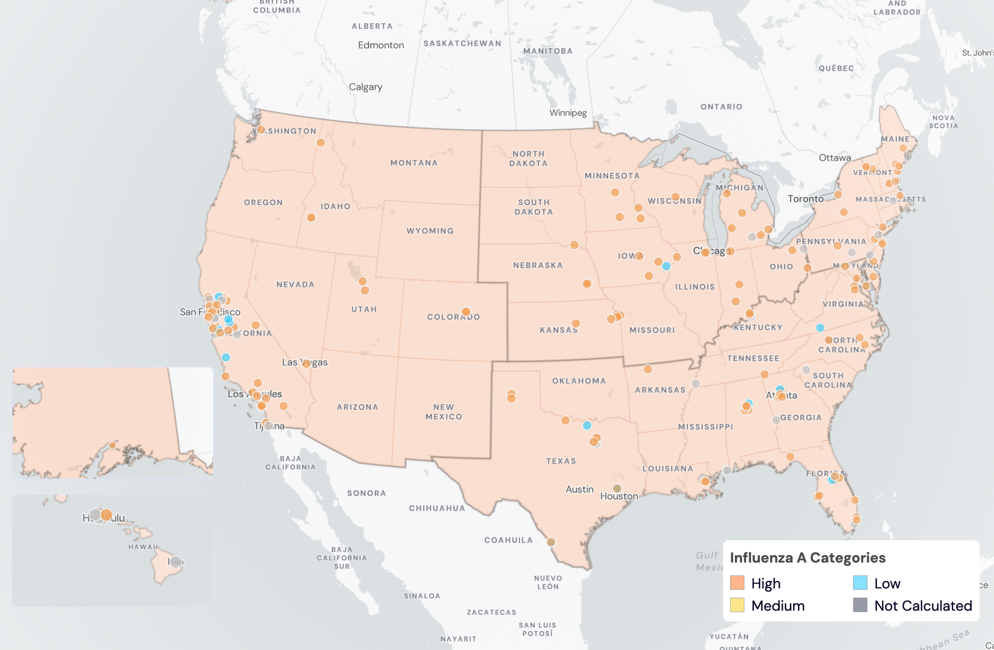 Below are the current Influenza A wastewater categories for all WWSCAN sites, with 75% of sites showing wastewater onset for IAV:
