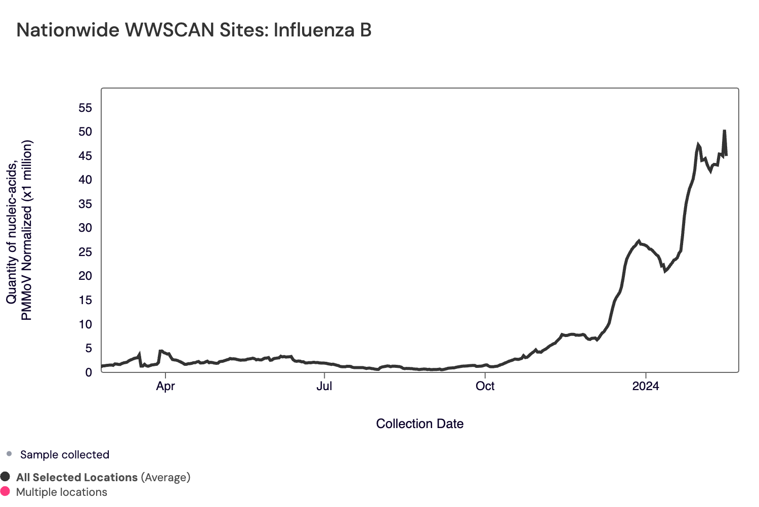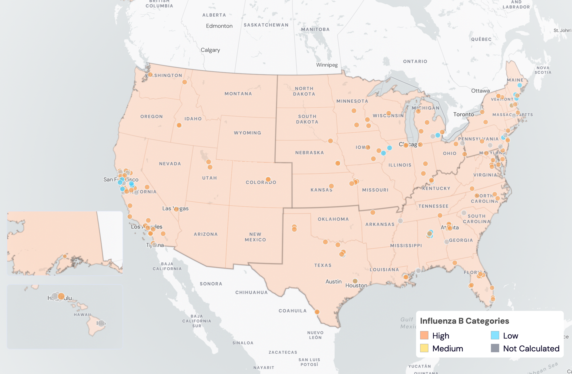 Nationally, influenza B is in the "High" category with >50% of sites showing onset of IBV in wastewater and aggregated measurements showing high concentrations with an upward trend over the last 21 days.