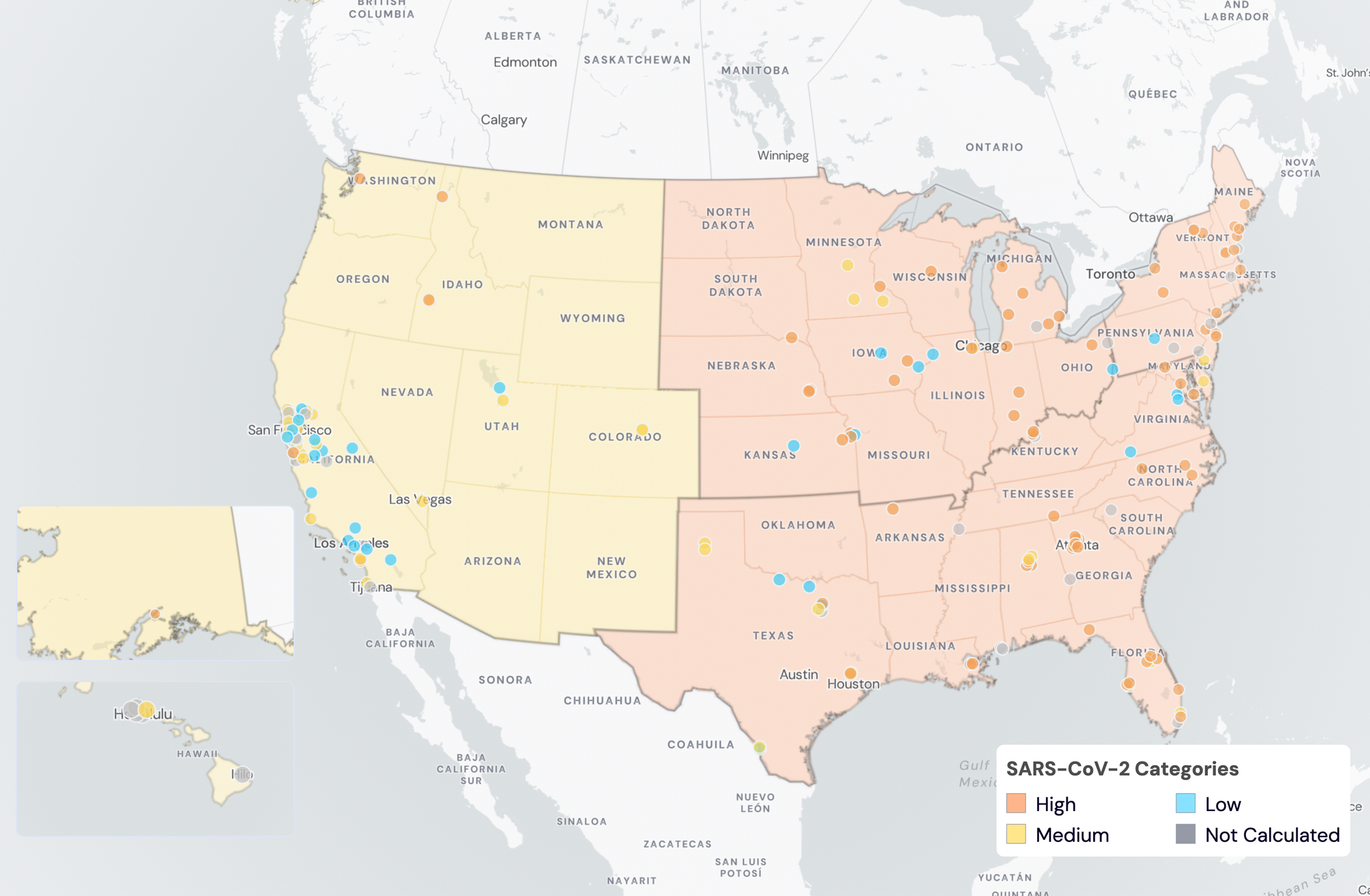 Below are the current SARS-CoV-2 wastewater categories for all WWSCAN sites:
