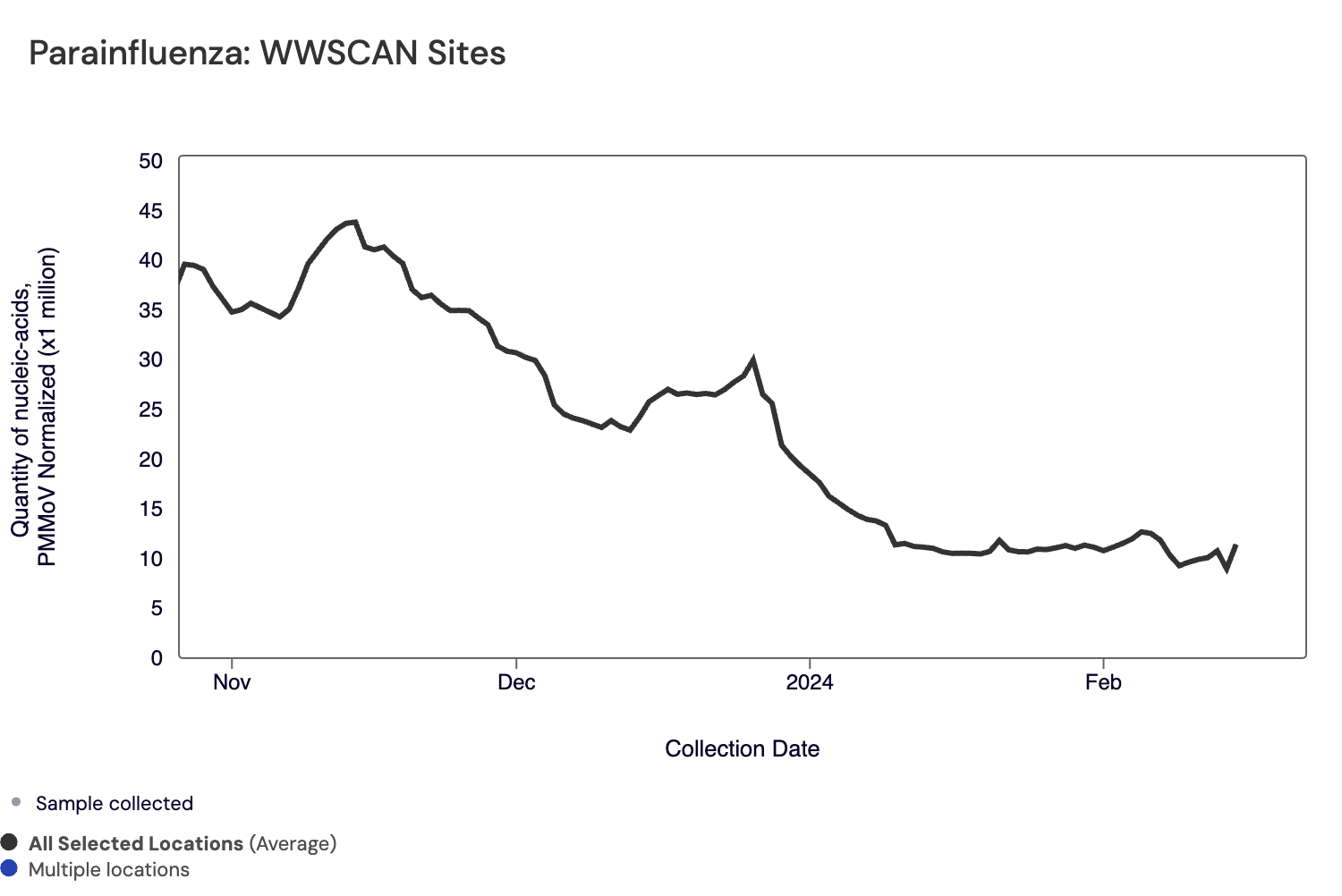 Human Parainfluenza (HPIV) RNA has been detected in ~49% of samples collected from WWSCAN sites. The HPIV median concentration across all sites over the last 21 days is 0 copies/gram. The population-weighted average line is shown below. You can interact with the chart of all the plants here. These data will become easier to interpret as we collect more data; we do not have enough data currently to start assessing trends or levels.