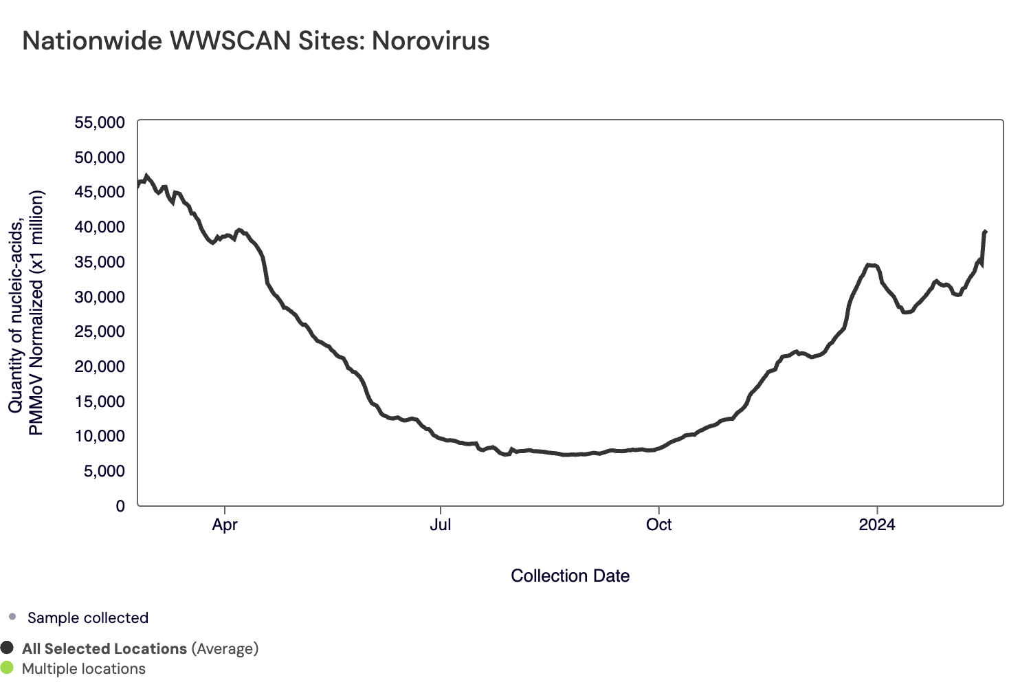 Nationally, Norovirus is in "High" category with aggregated measurements showing high concentrations and an upward significant trend over the past 21 days.