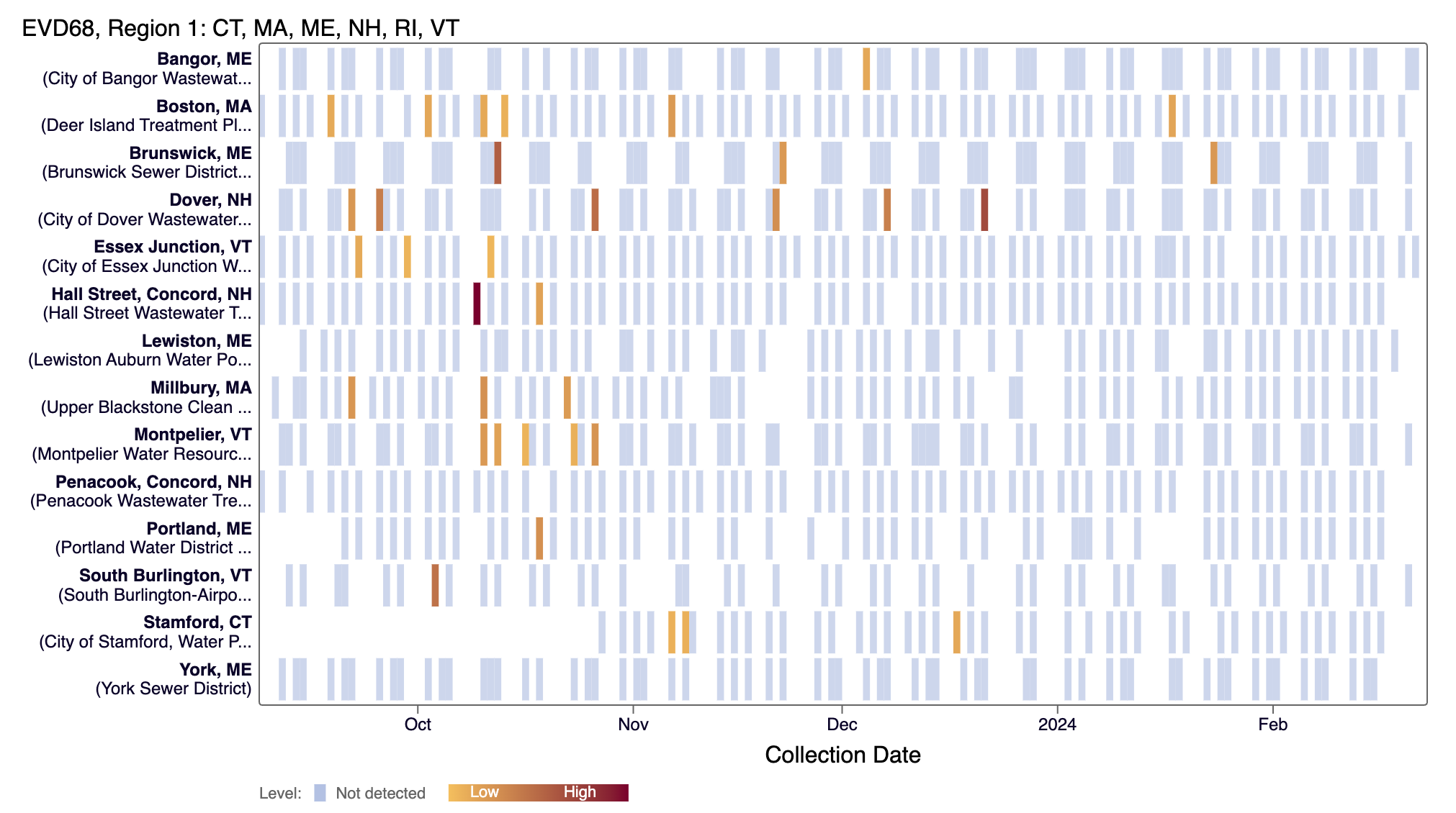 Enterovirus D68 (EV-D68) RNA was rarely detected (~6%) in samples collected in the last 21 days at most WWSCAN sites and the median concentration across all sites over the last 21 days is below the level of detection. The heat map below shows all WWSCAN sites in HHS Region 1 as a row, and each date as a column since monitoring began in September 2023. The color blue means the sample was non-detect for EV-D68 RNA and the colors get darker with higher concentrations. White indicates no sample was collected.