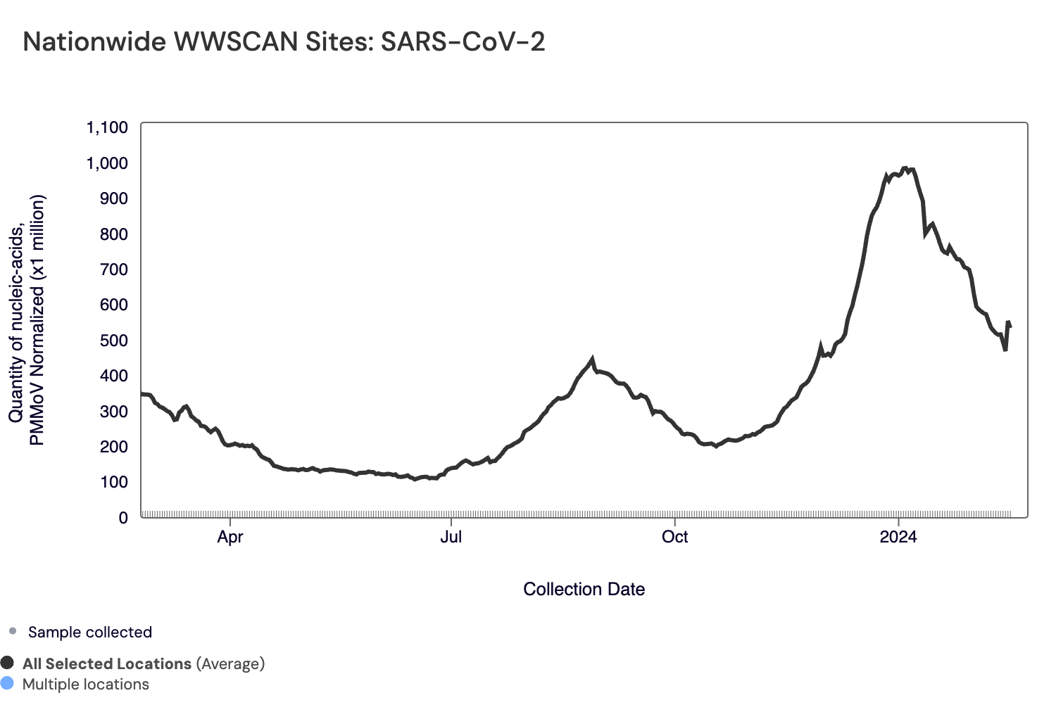 SARS-CoV-2 N gene RNA median concentration across all sites over the last 21 days is 155,712 copies/gram. For reference, the median concentration in January 2024 was 226,648 copies/gram. Below is the population weighted average SARS-CoV-2 N gene concentrations (normalized by PMMoV) from all participating WWSCAN sites across the country over the last 365 days.