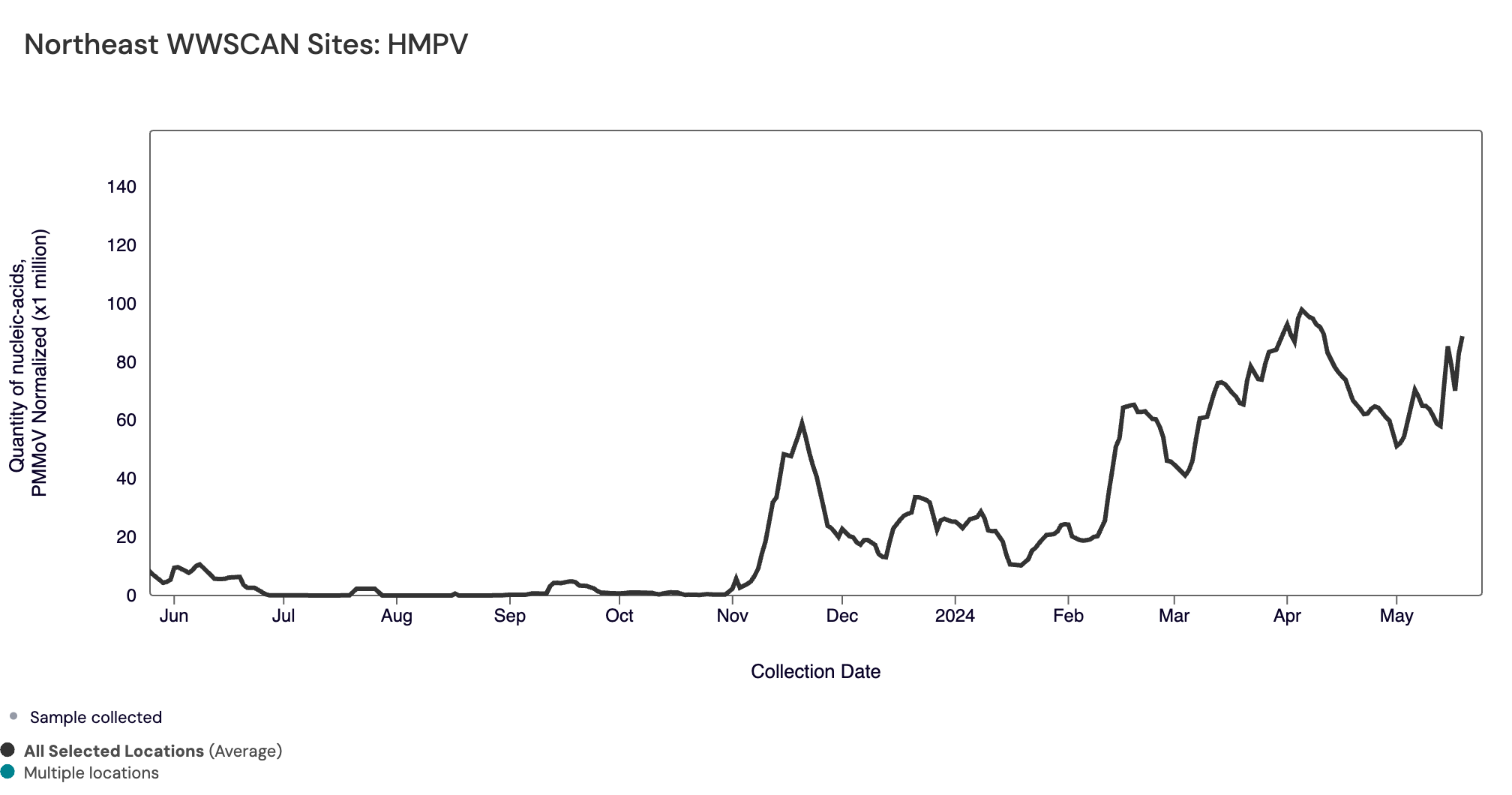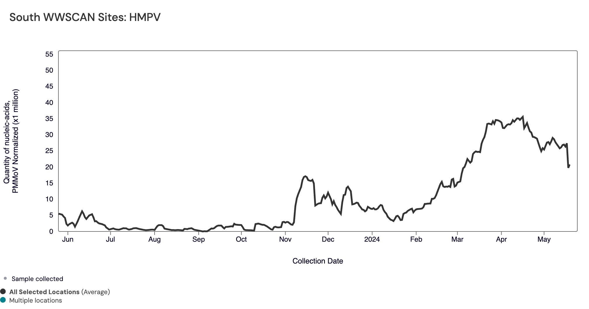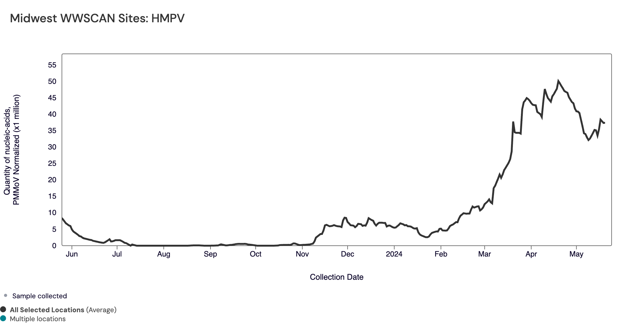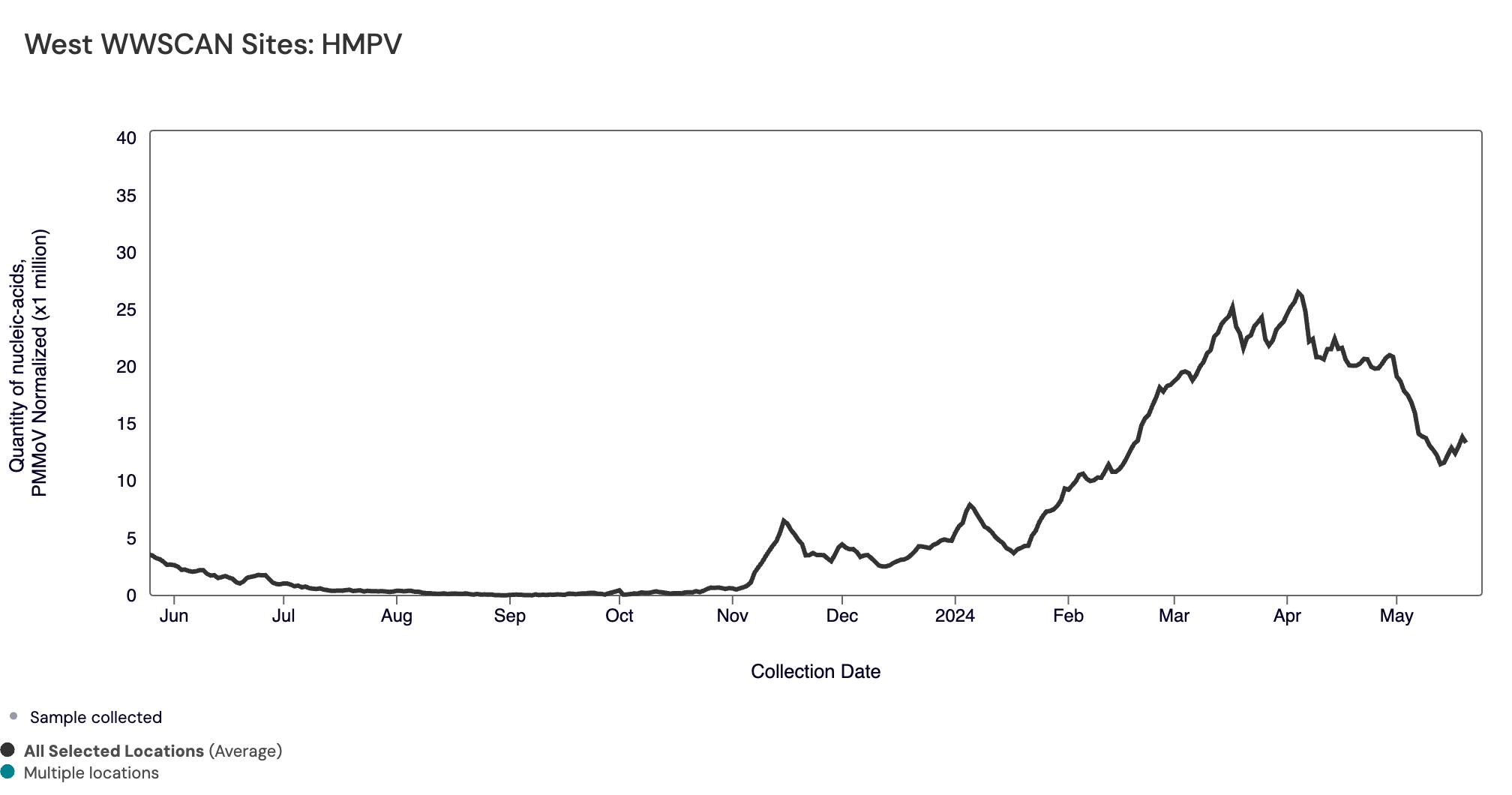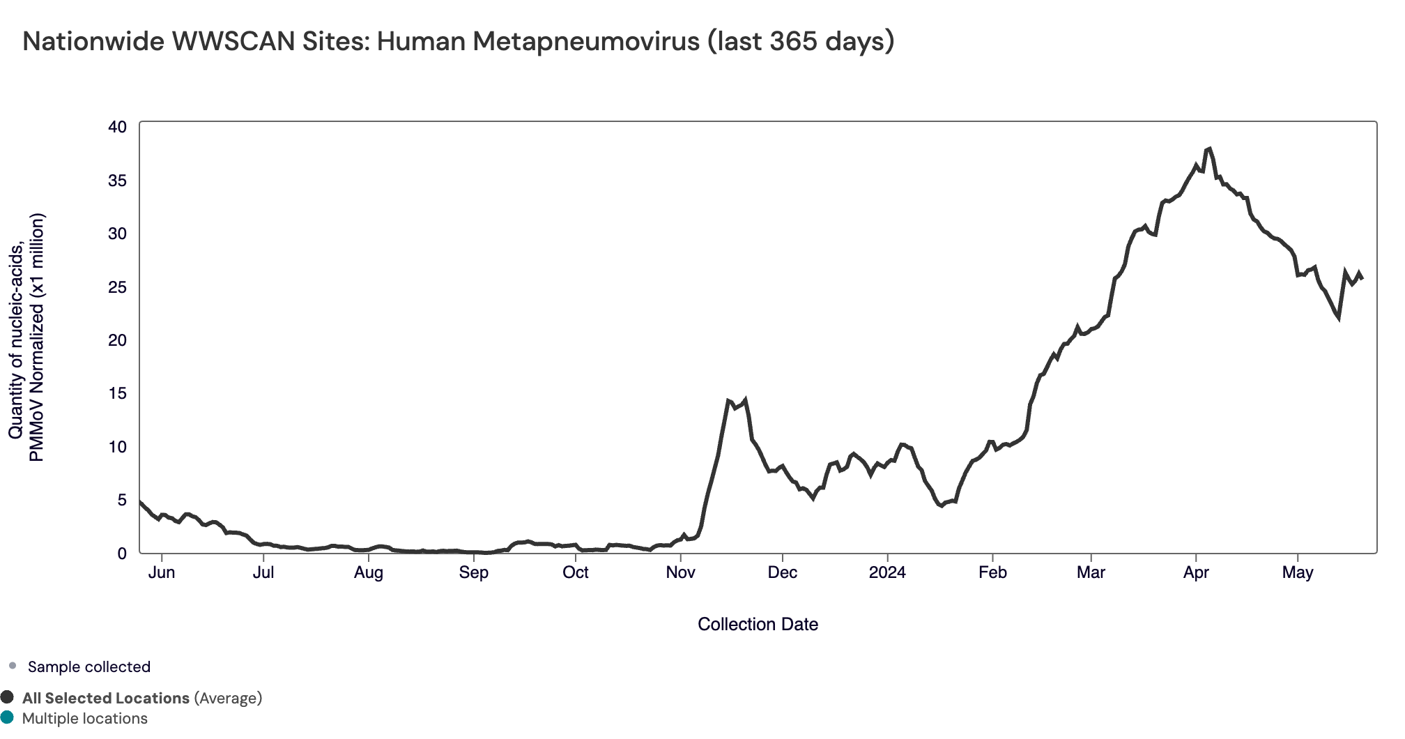 HMPV (human metapneumovirus) RNA median concentrations across all sites over the last 21 days is 6,923 copies/gram. There have been detected in ~73% of samples over the last 21 days. Below is the population weighted average HMPV RNA concentrations (normalized by PMMoV) from all participating WWSCAN sites across the country over the last 365 days.