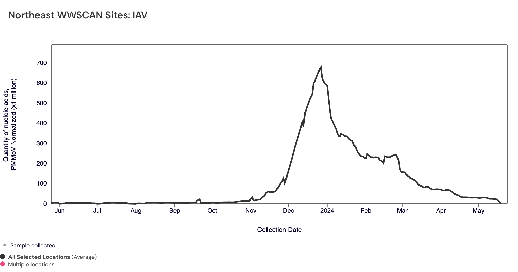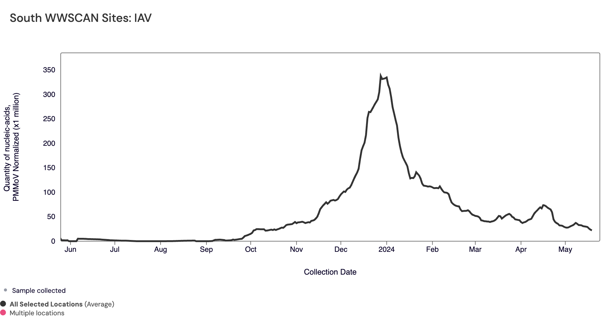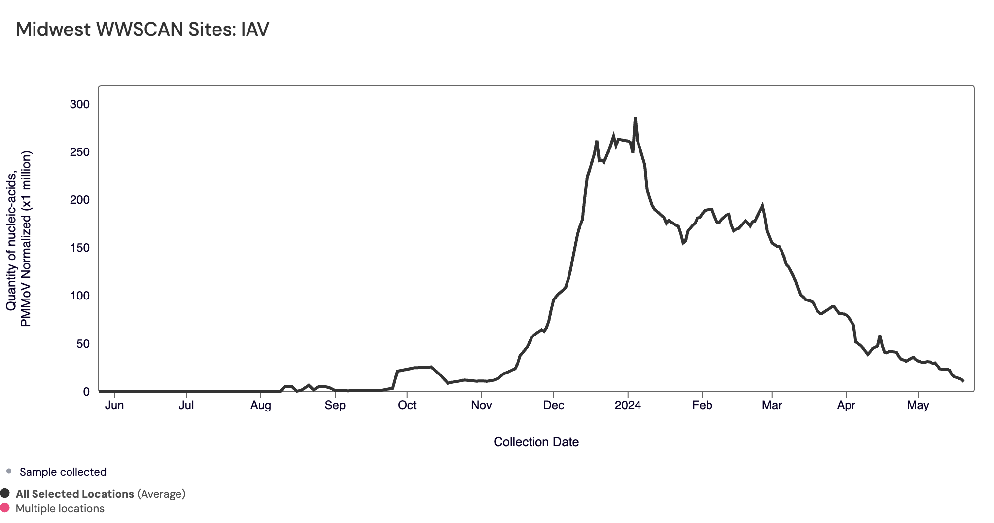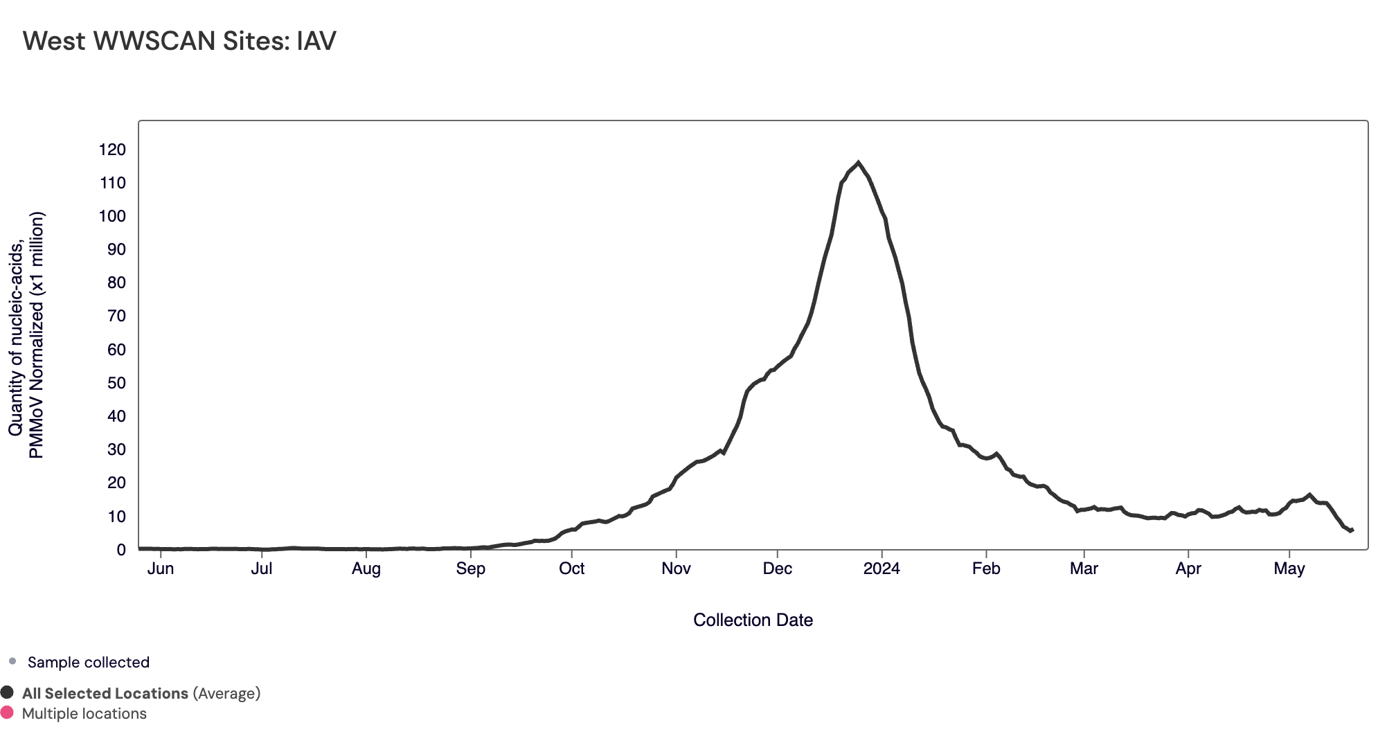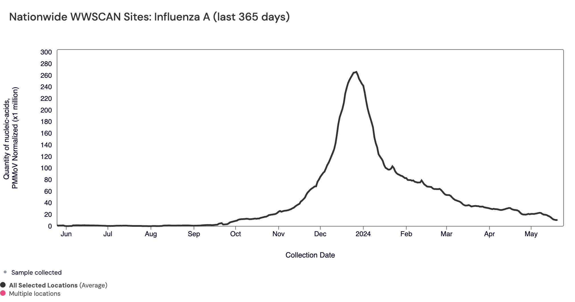 Influenza A (IAV) RNA median concentration across all sites over the last 21 days is 5,807 copies/gram. For reference, the median concentration in April 2024 was 7,298 copies/gram. Below is the population weighted average IAV concentrations (normalized by PMMoV) from all participating WWSCAN sites across the country over the last 365 days.