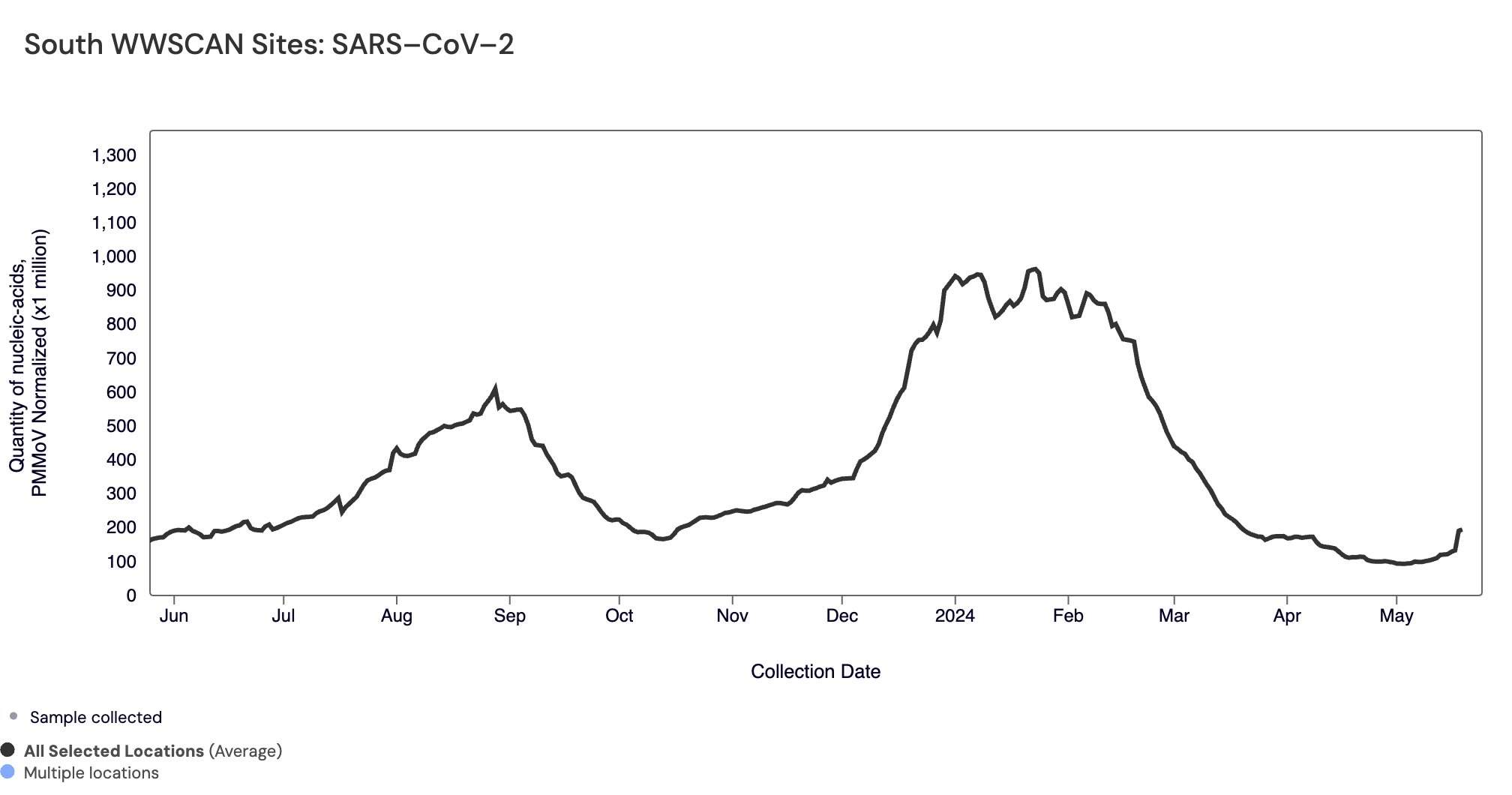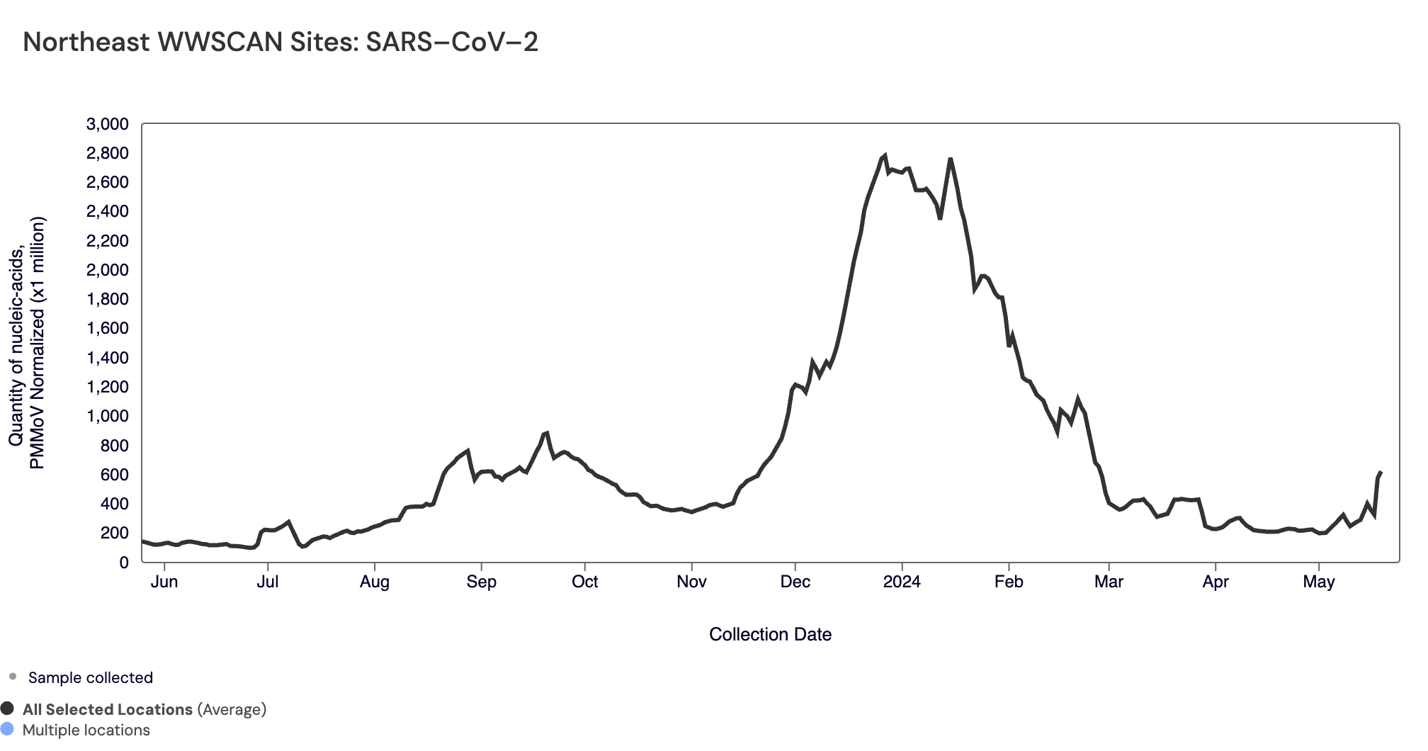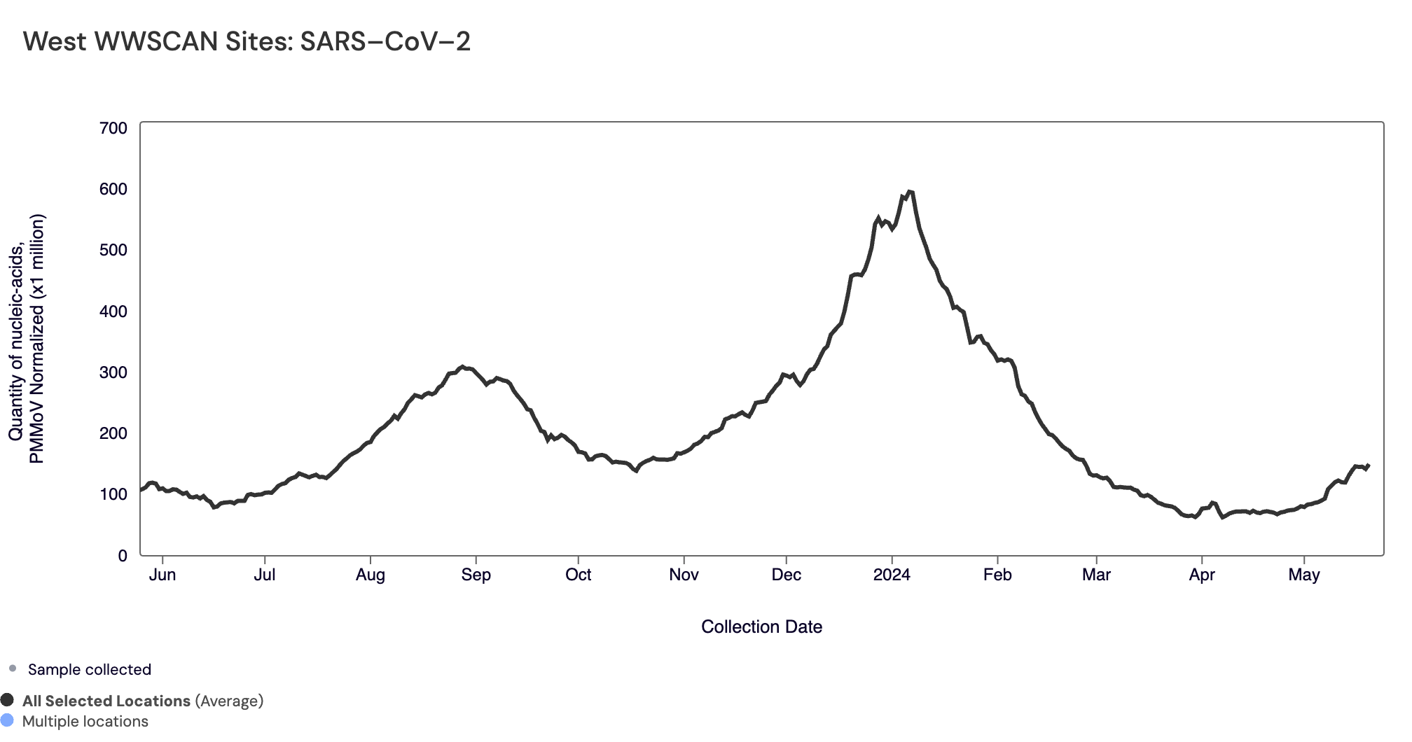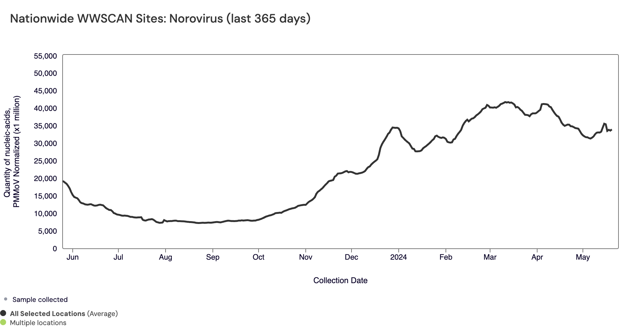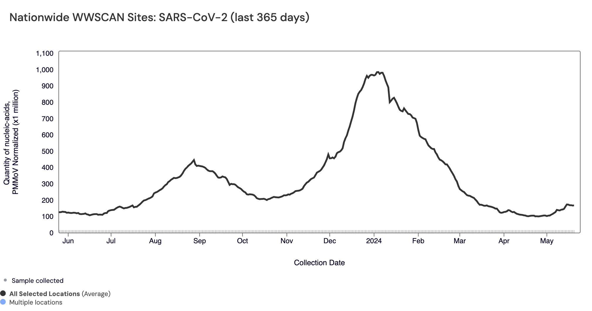SARS-CoV-2 N gene RNA median concentration across all sites over the last 21 days is 41,824 copies/gram. For reference, the median concentration in April 2024 was 38,787 copies/gram. Below is the population weighted average SARS-CoV-2 N gene concentrations (normalized by PMMoV) from all participating WWSCAN sites across the country over the last 365 days.