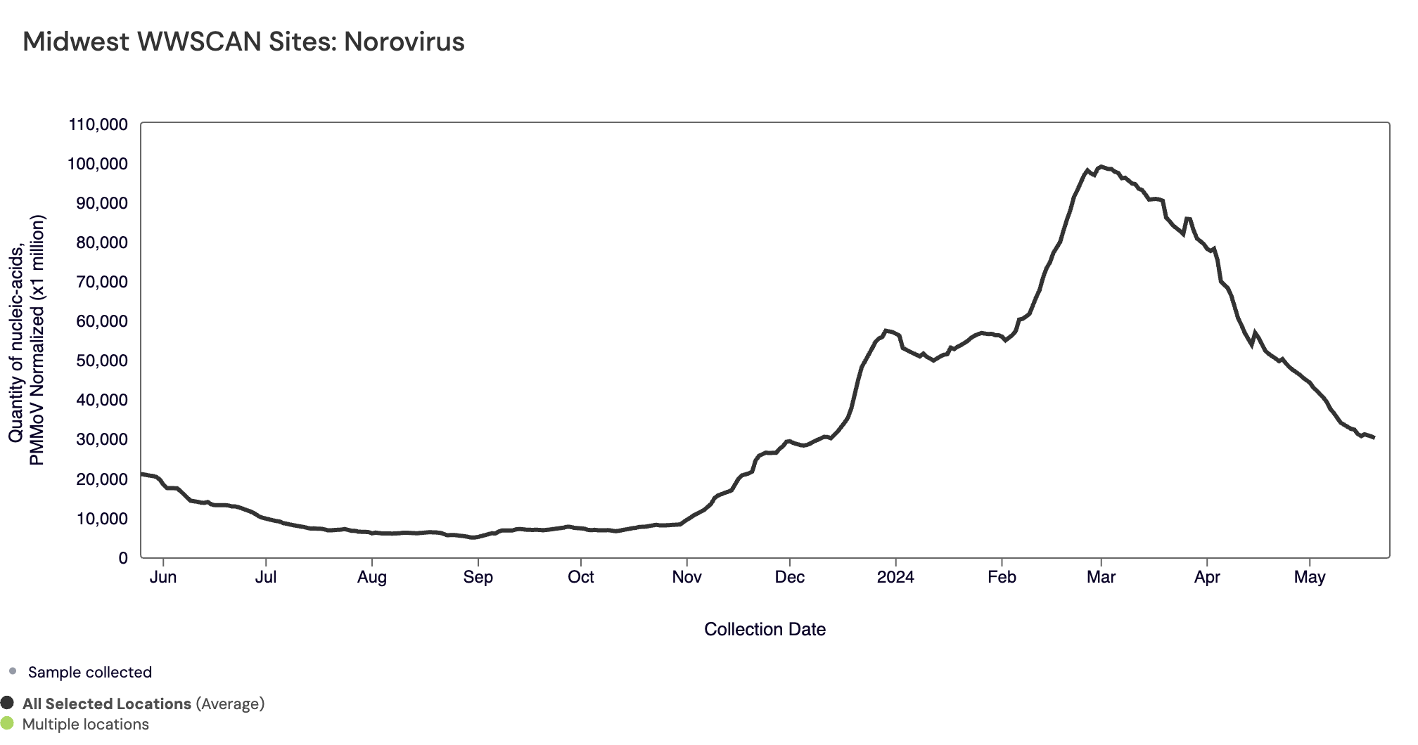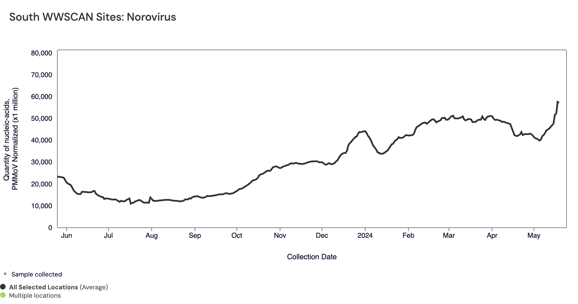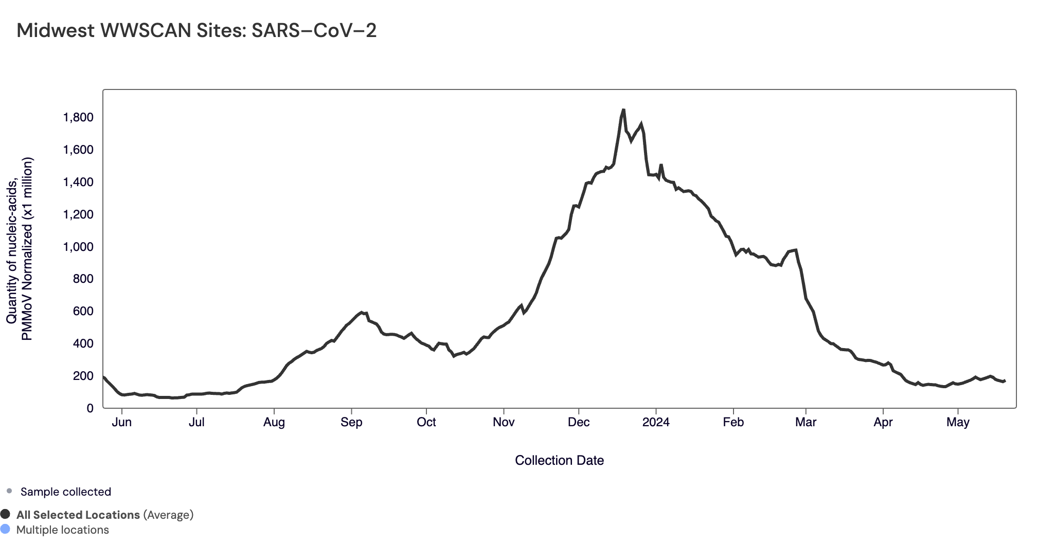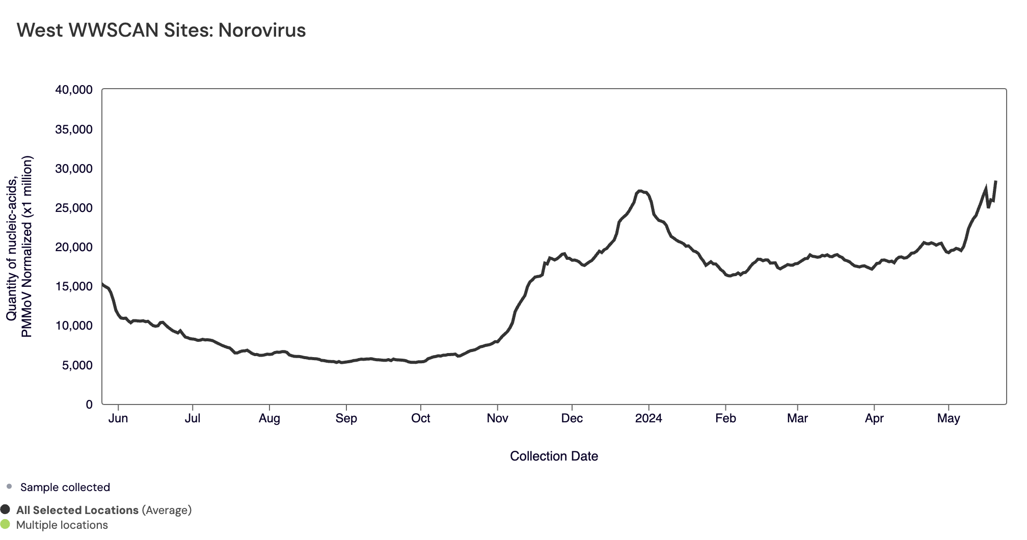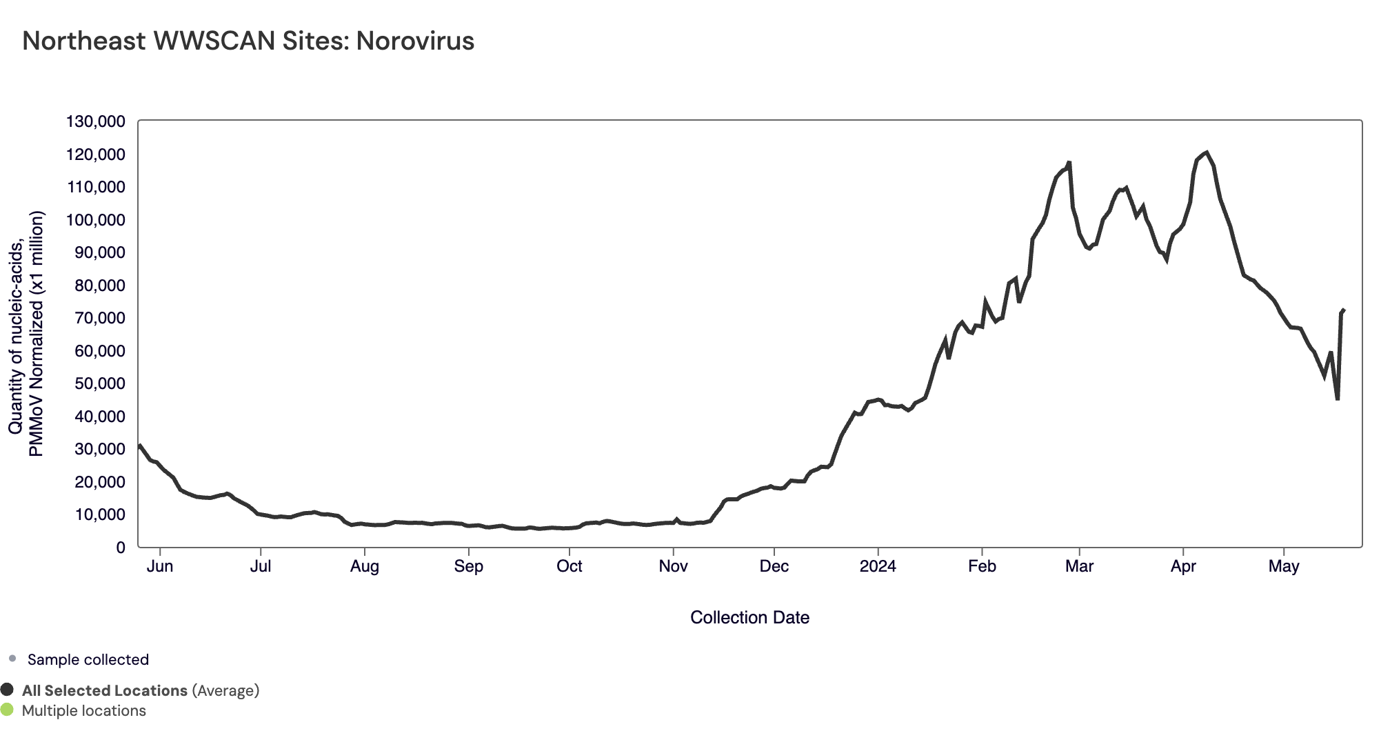 SARS-CoV-2 N gene RNA median concentration across all sites over the last 21 days is 41,824 copies/gram. For reference, the median concentration in April 2024 was 38,787 copies/gram. Below is the population weighted average SARS-CoV-2 N gene concentrations (normalized by PMMoV) from all participating WWSCAN sites across the country over the last 365 days.