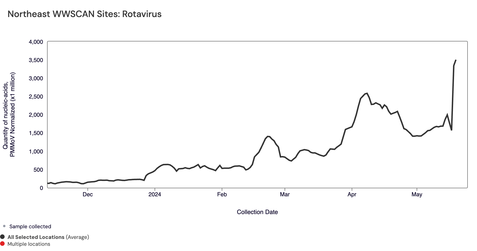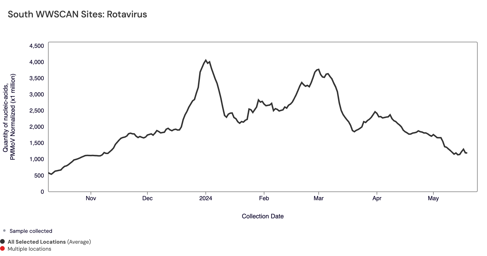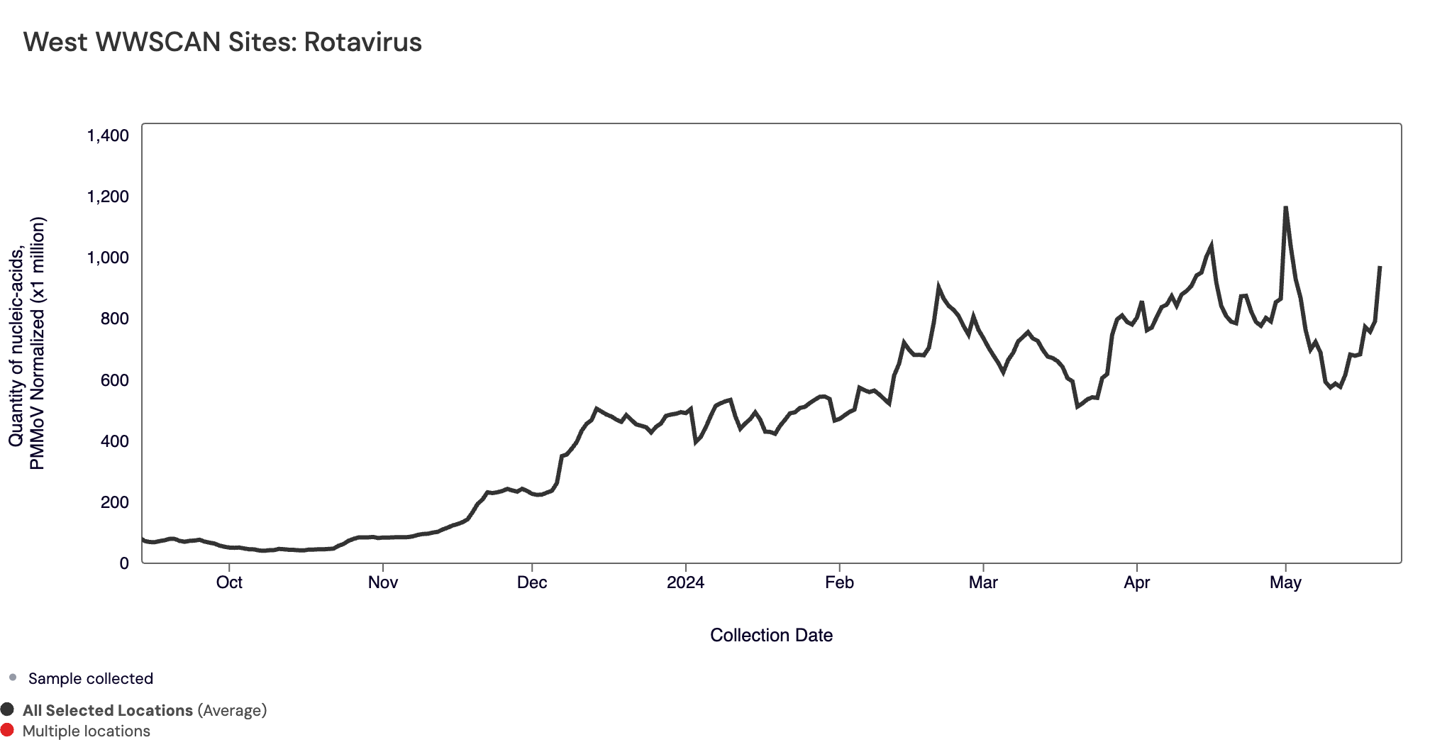 Rotavirus RNA median concentrations across all sites over the last 21 days is 234,327 copies/gram. For reference, the median concentration in April 2024 was 347,466 copies/gram. Below are the Rotavirus RNA concentrations (normalized by PMMoV) from all participating WWSCAN sites across the country. The population-weighted average is shown.