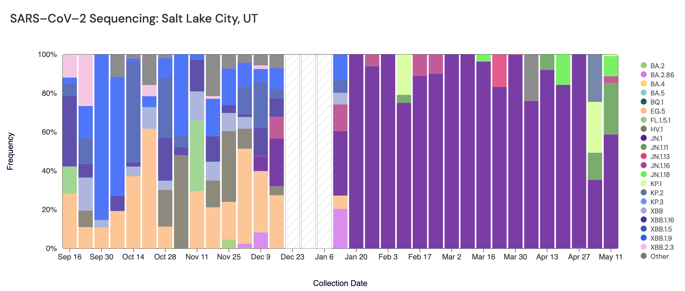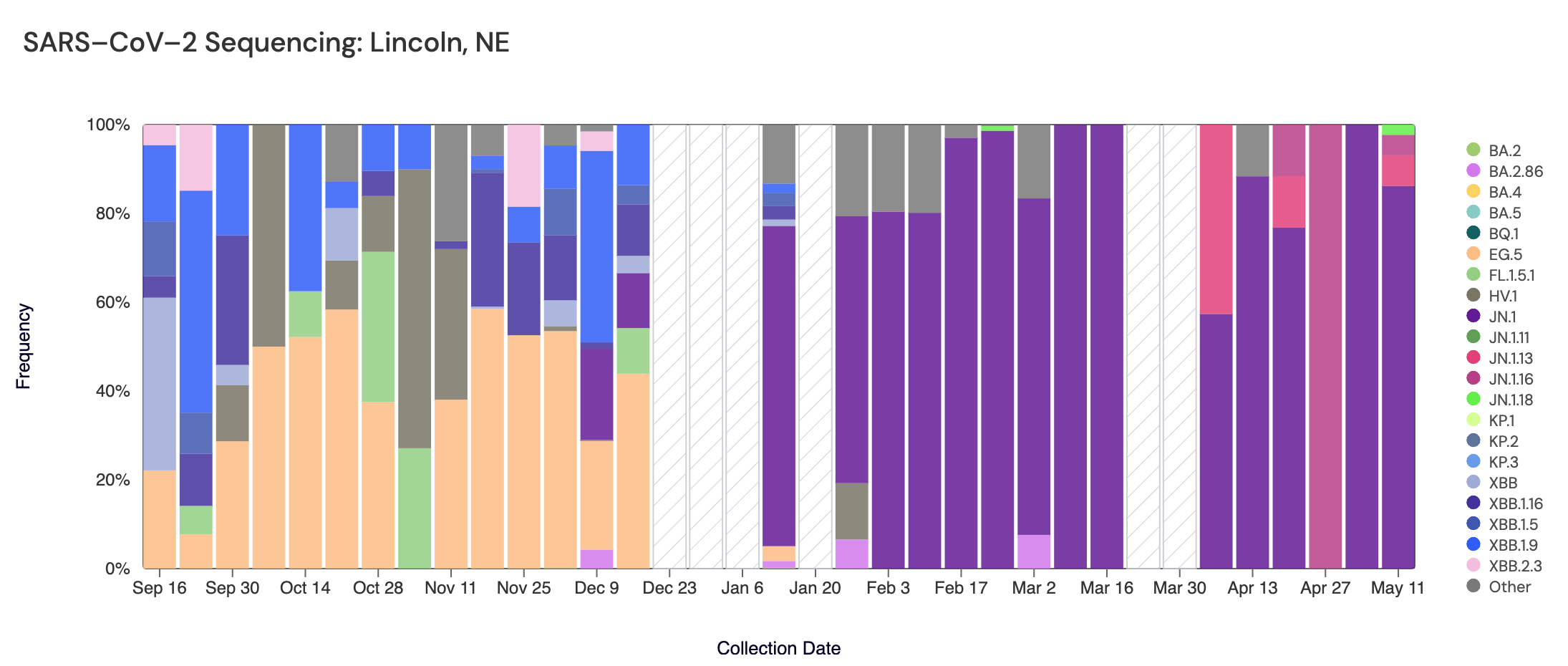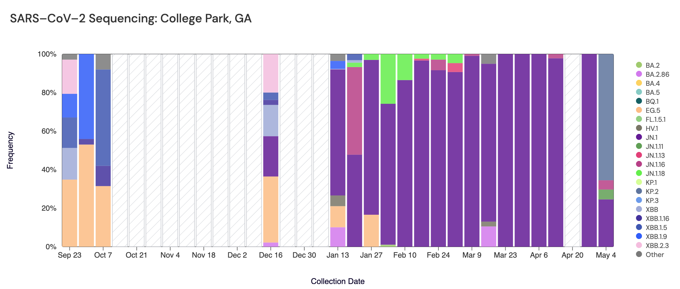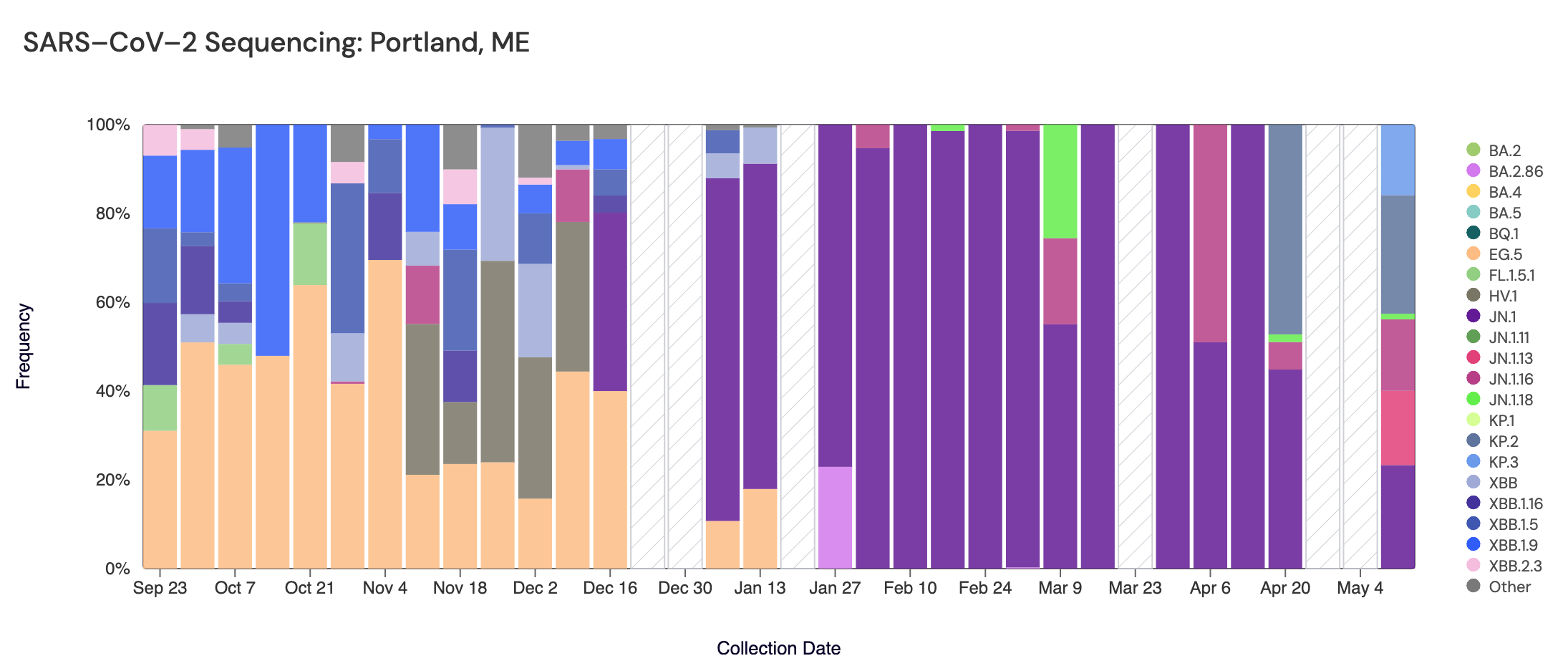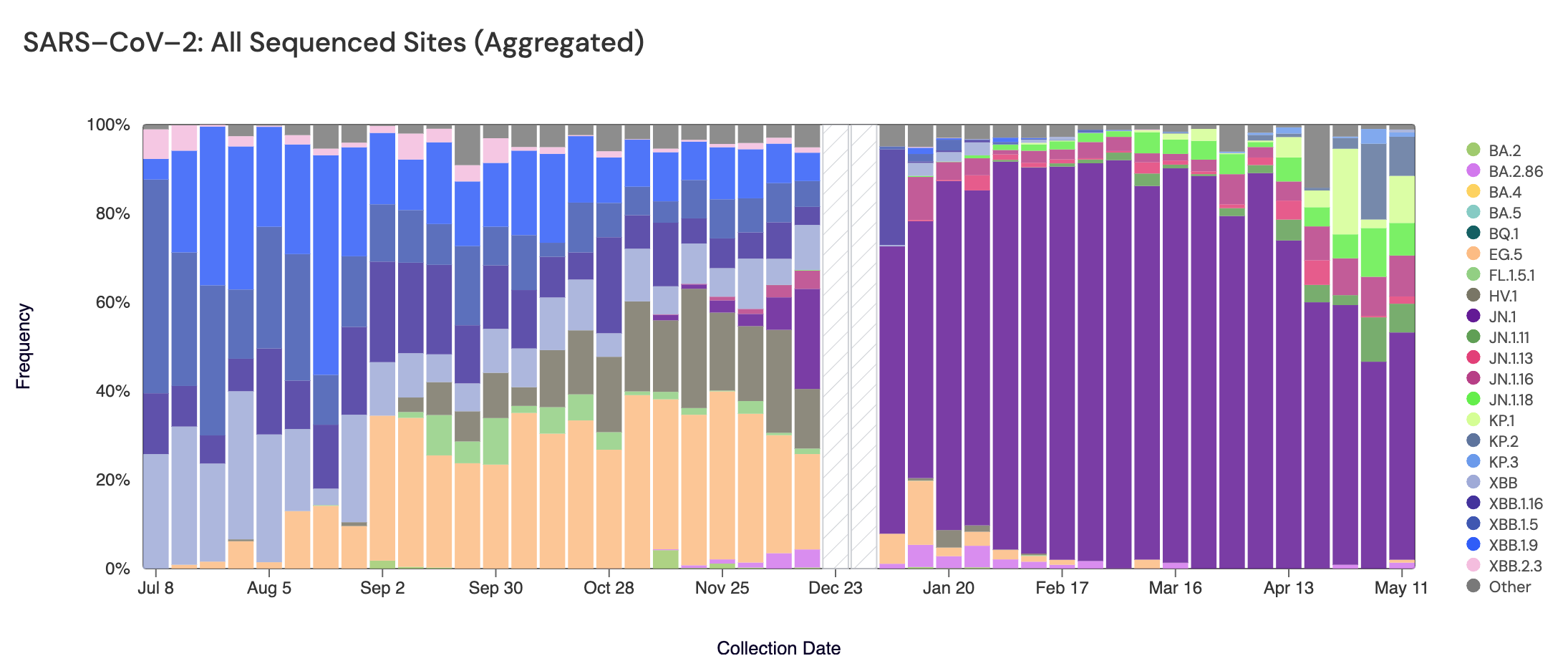 Sequencing data is also available in aggregate across all sites in WWSCAN with sequencing data. That plot is shown below and also suggests that JN.1 (shown in purple) is the still most abundant variant across all sites (51.2%).