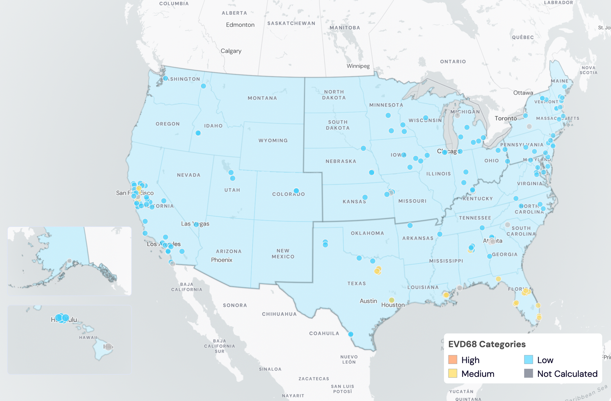 Below are the current EV-D68 wastewater categories for all WWSCAN sites (recall the category is determined by the frequency of detection):