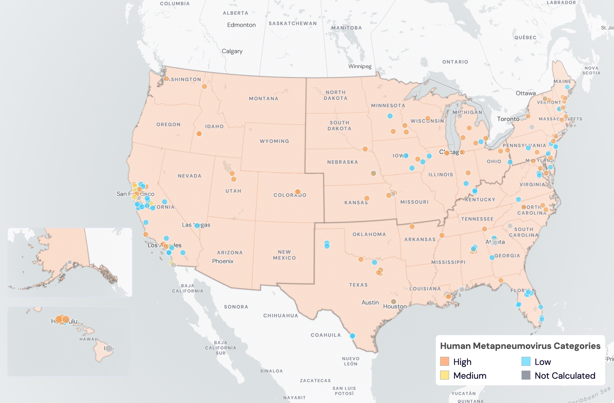 HMPV Wastewater Categories. This map includes sample collection data through May 23, 2024. Each dot represents a single site and the four US Census regions are outlined in gray. Midwest Region includes: IA, IL, IN, KS, MI, MN, NE, OH, SD, WI. Northeast Region includes: CT, MA, ME, NH, NJ, NY, PA, VT. Southern Region includes: AL, AR, DE, FL, GA, KY, LA, MD, MS, NC, TN, TX, VA, WV and Washington DC. Western Region includes: AK, CA, CO, HI, ID, NV, UT, WA.