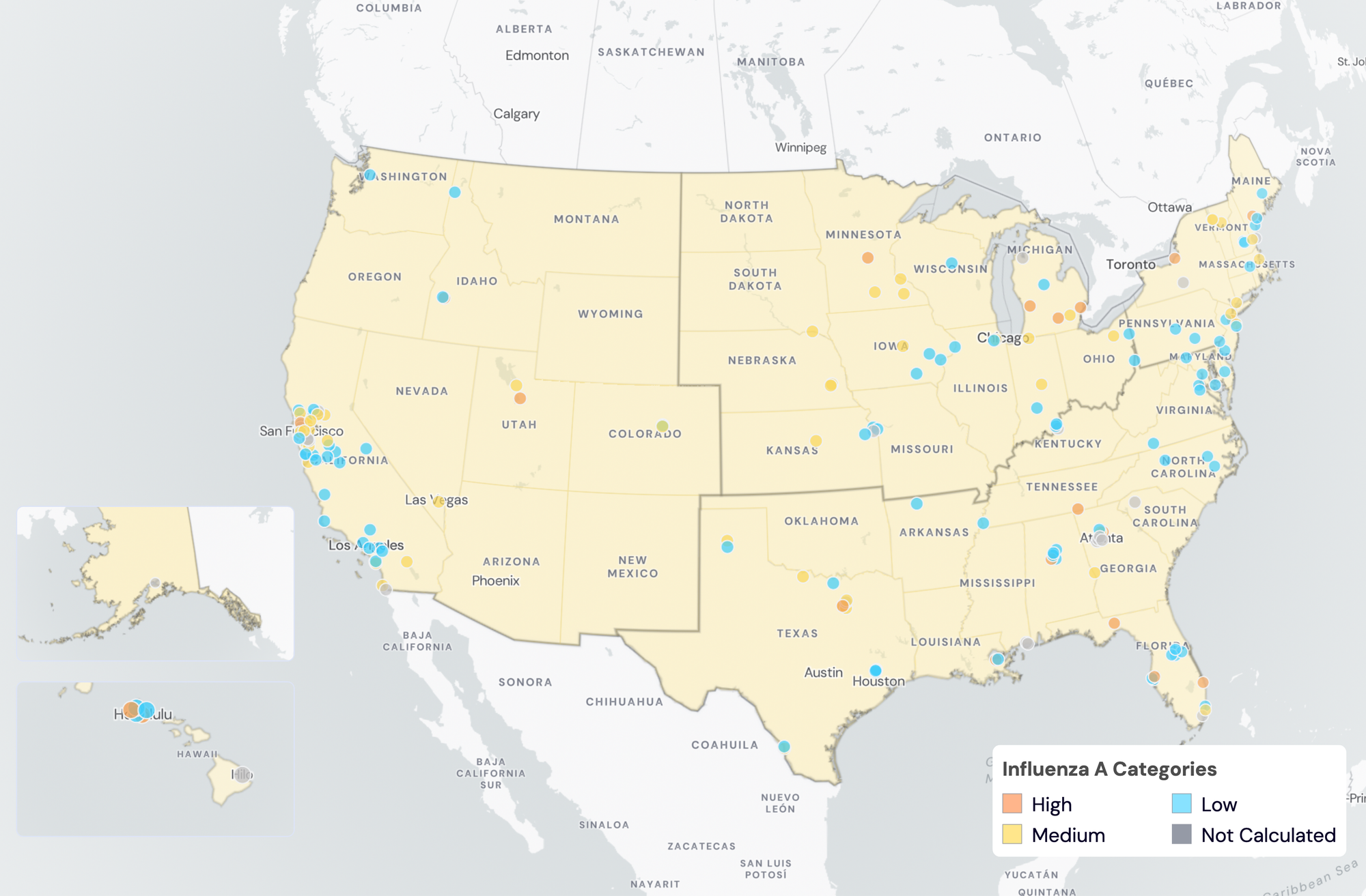 IAV Wastewater Categories. This map includes sample collection data through May 23, 2024. Each dot represents a single site and the four US Census regions are outlined in gray. Midwest Region includes: IA, IL, IN, KS, MI, MN, NE, OH, SD, WI. Northeast Region includes: CT, MA, ME, NH, NJ, NY, PA, VT. Southern Region includes: AL, AR, DE, FL, GA, KY, LA, MD, MS, NC, TN, TX, VA, WV and Washington DC. Western Region includes: AK, CA, CO, HI, ID, NV, UT, WA.