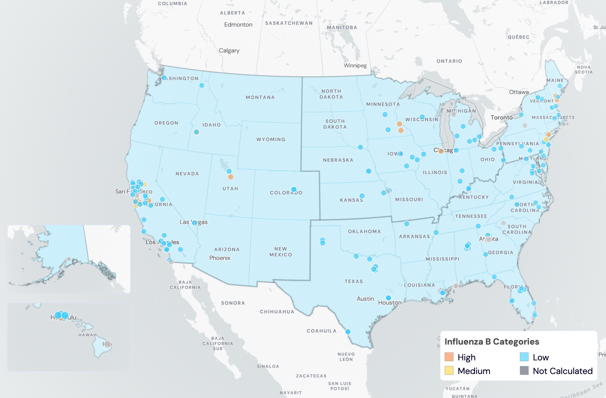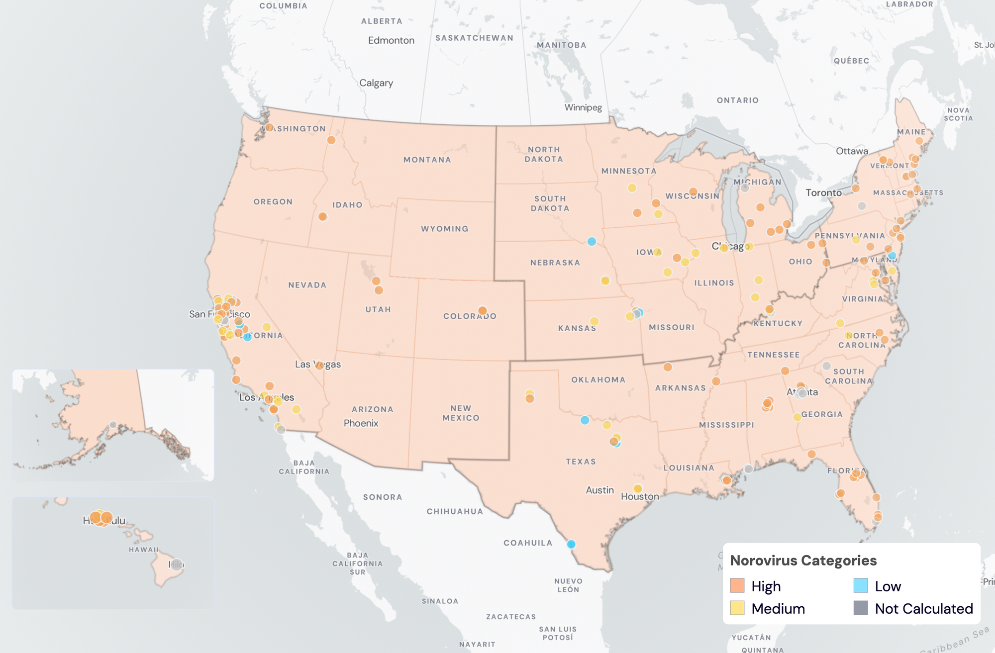Norovirus Wastewater Categories. This map includes sample collection data through May 23, 2024. Each dot represents a single site and the four US Census regions are outlined in gray. Midwest states: IA, IL, IN, KS, MI, MN, NE, OH, SD, WI. Northeast states: CT, MA, ME, NH, NJ, NY, PA, VT. Southern states: AL, AR, DE, FL, GA, KY, LA, MD, MS, NC, TN, TX, VA, WV and Washington DC. Western States: AK, CA, CO, HI, ID, NV, UT, WA.