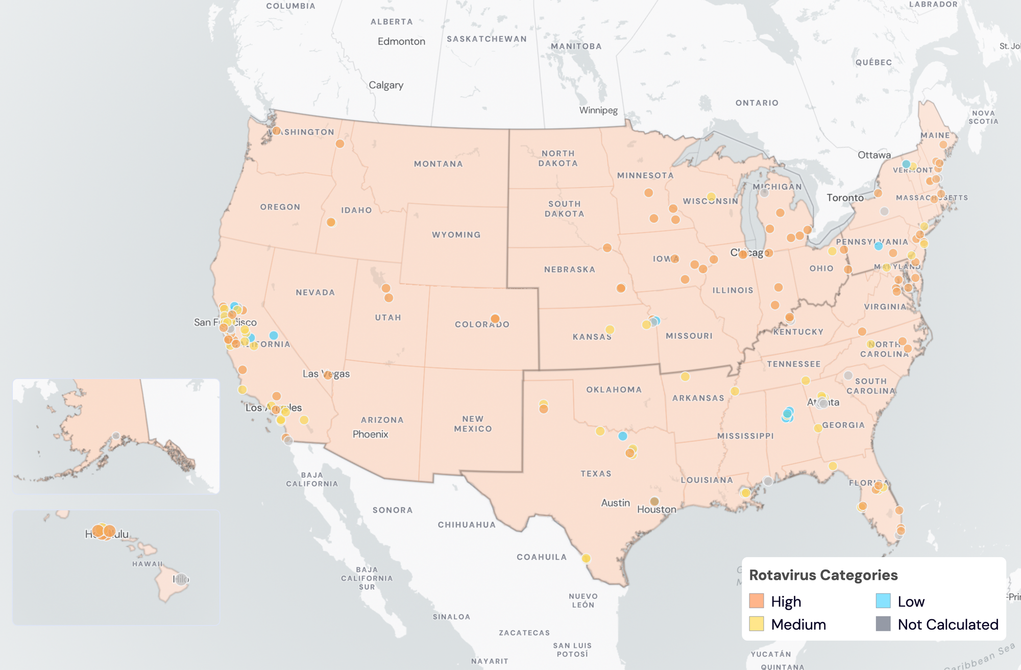 Rotavirus Wastewater Categories. This map includes sample collection data through May 23, 2024. Each dot represents a single site and the four US Census regions are outlined in gray. Midwest states: IA, IL, IN, KS, MI, MN, NE, OH, SD, WI. Northeast states: CT, MA, ME, NH, NJ, NY, PA, VT. Southern states: AL, AR, DE, FL, GA, KY, LA, MD, MS, NC, TN, TX, VA, WV and Washington DC. Western States: AK, CA, CO, HI, ID, NV, UT, WA.