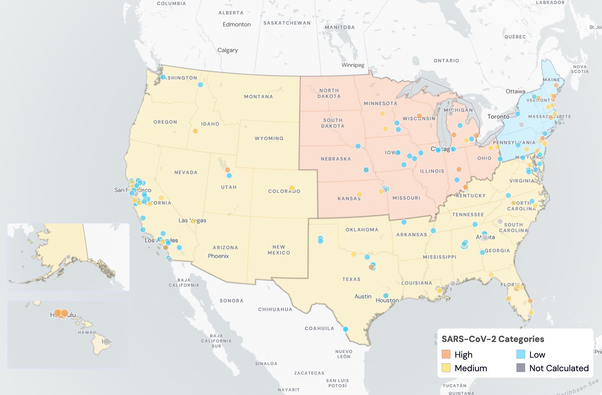 Below are the current SARS-CoV-2 wastewater categories for all WWSCAN sites (recall the category is determined by both the trend and the level):