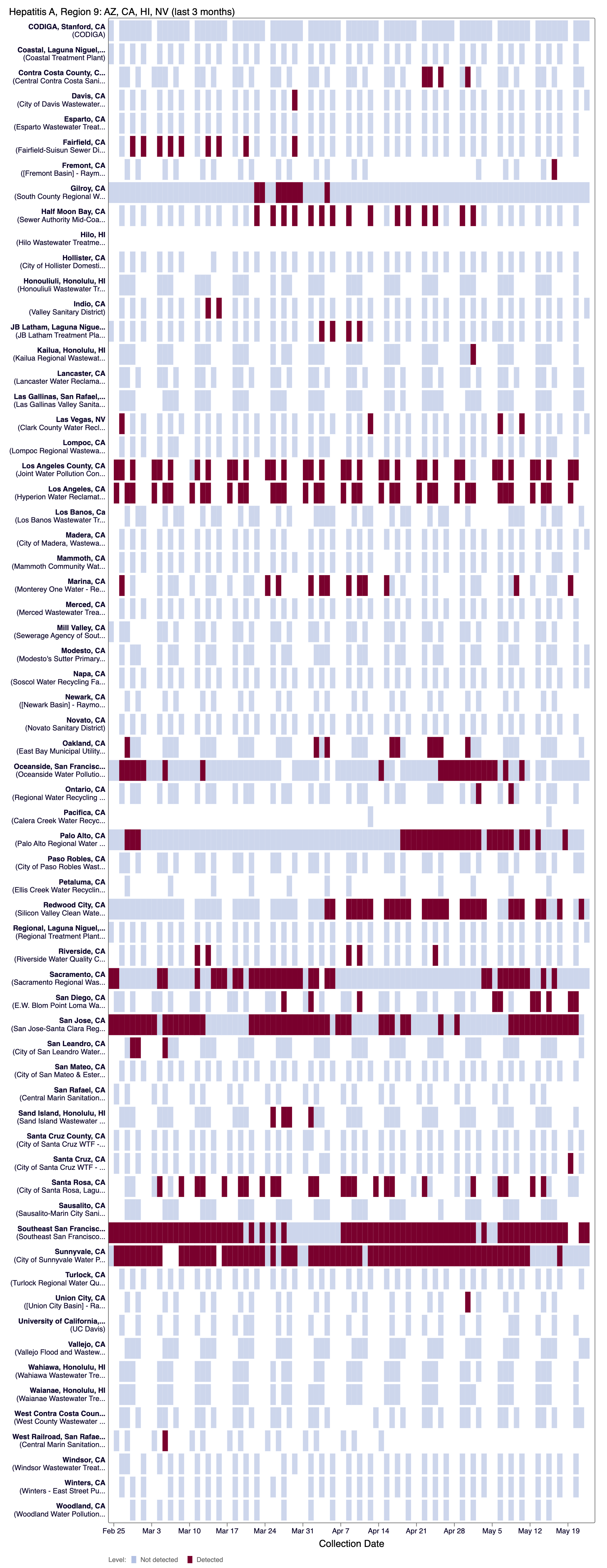 The chart below shows each WWSCAN plant in HHS Region 9 as rows, and days as columns (labeled at the bottom axis). White indicates no samples, blue is a non-detect for Hep A RNA and red is a detection for Hep A RNA.