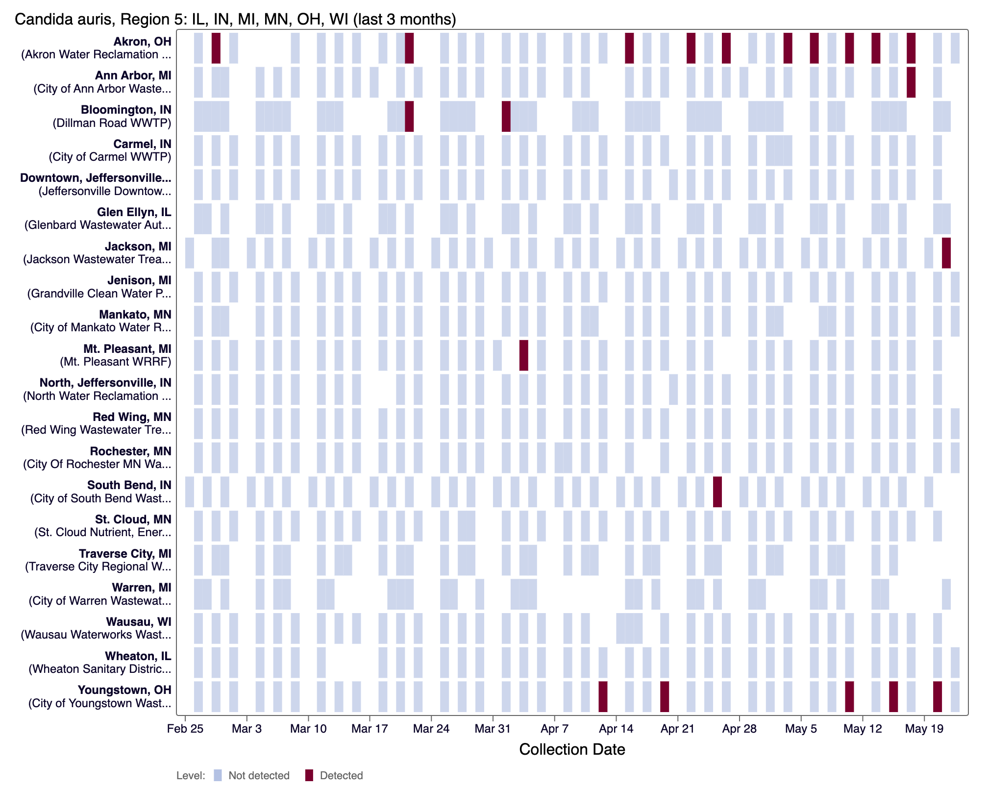 The chart below shows each WWSCAN plant in HHS Region 5 as rows, and days as columns (labeled at the bottom axis). White indicates no samples, blue is non-detect for C. auris DNA and red is detect for C. auris DNA.