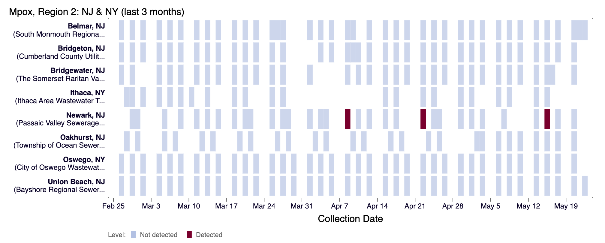 The chart below plants in HHS region 2 as rows, and the last 21 days as columns (labeled at the bottom axis). White indicates no samples, blue is non-detect for mpox DNA and red is detect for mpox DNA.