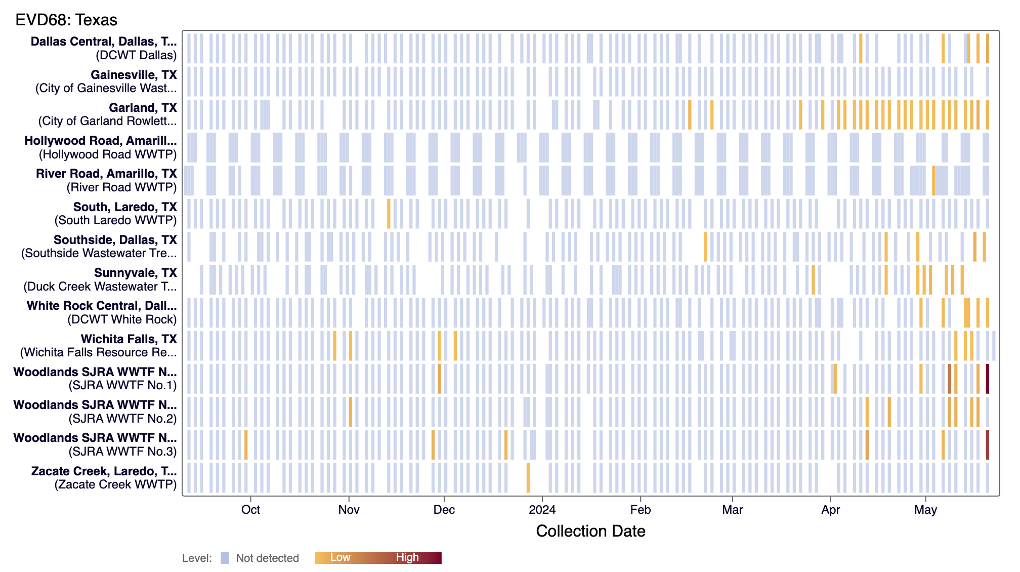 The chart below plants in Texas as rows, and the days as columns (labeled at the bottom axis). White indicates no samples, blue is non-detect for EV-D68 DNA and red is detect for EV-D68 RNA.