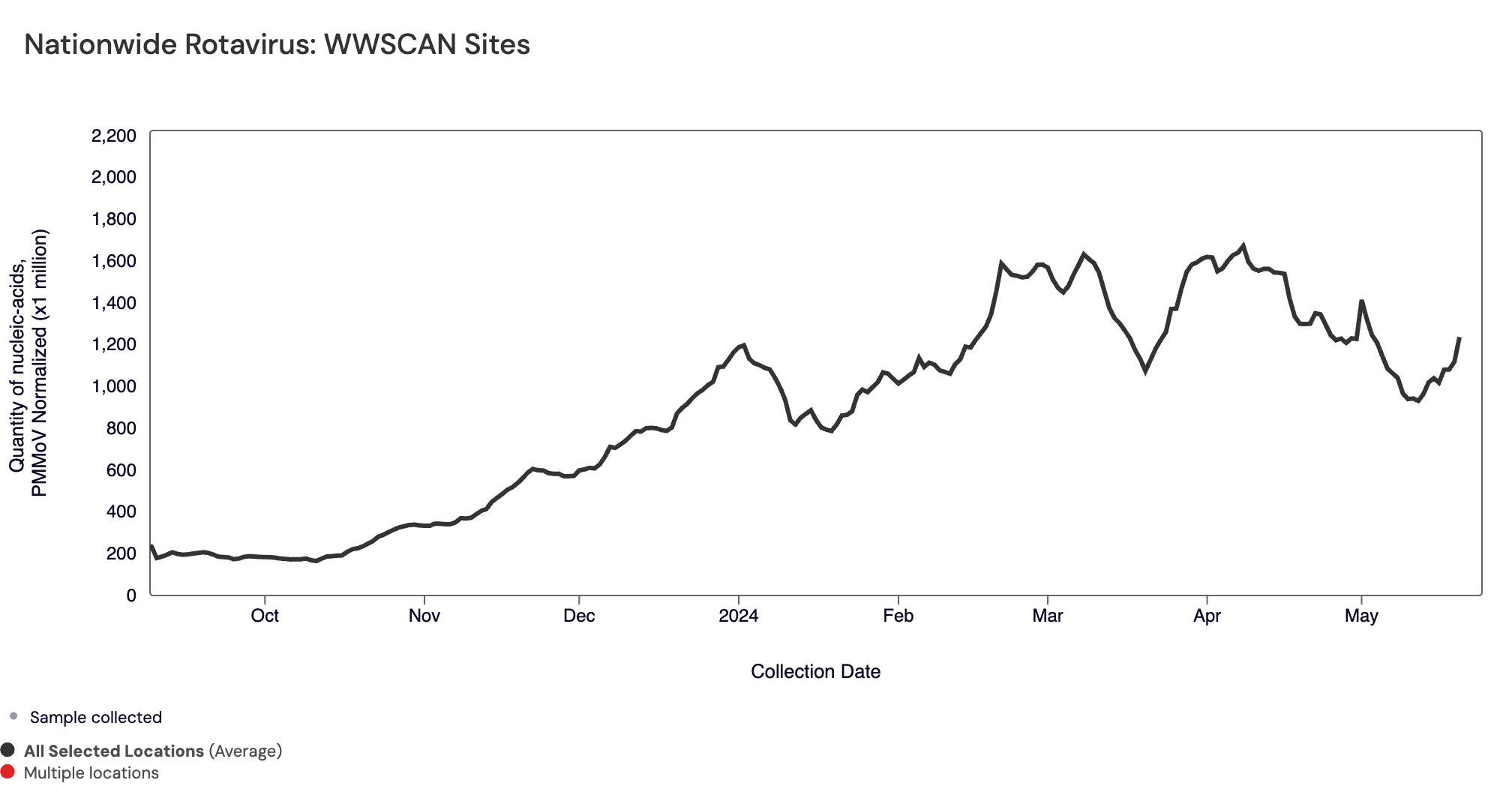 Nationally, Rotavirus is in "High" category with aggregated measurements showing high concentrations with a downward trend in the last 21 days.