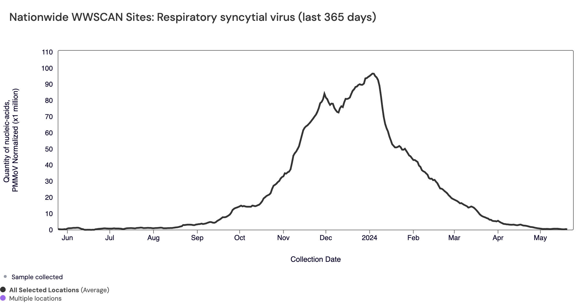 Respiratory syncytial virus (RSV) RSV RNA median concentration across all sites over the last 21 days is below the limit of detection. Below are the RSV RNA concentrations (normalized by PMMoV) from all participating WWSCAN sites across the country over the last 365 days shown as the population-weighted average.
