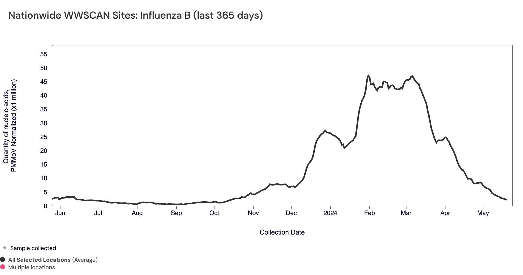 Influenza B (IBV) RNA has been detected ~37% samples in the last 21 days. IBV RNA median concentration across all sites over the last 21 days is below the limit of detection. For reference, the median concentration in April 2024 was 3,346 copies/gram. Below is the population-weighted average IBV RNA concentrations (normalized by PMMoV) from all participating WWSCAN sites across the country over the last 365 days.