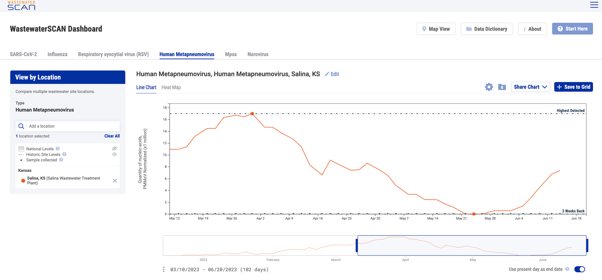 Historic reference levels can be turned on for an individual site. The two reference lines that appear for an individual site plot when the feature is turned on are ‘3 Weeks Back’ and ‘Highest Detected,’ and the points these are based on will be highlighted. These values are based on the smoothed, trimmed average values. These lines are used to provide context as to how the most recent sample compares to where wastewater levels were 3 weeks ago and the highest levels detected as an individual sites. Click the eye icon next to "Historic Site Levels" to show this feature.