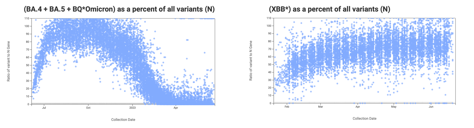 The ratio of the XBB* mutations/N across all WWSCAN plants is shown in the chart below on the right. As the ratio reaches 100%, it suggests that all the SARS-CoV-2 genomes in wastewater have the XBB* mutations. These data indicate that the average ratio XBB* mutations/N is ~75% but some places show levels as high as 80-100%. This suggests the majority of infections across the communities are caused by XBB*. The chart on the left shows the ratio of the BA.5, BA.4, and BQ* mutation/N across all WWSCAN plants. It can be read the same way as the XBB* chart. The average ratio is about <10%. Note that our XBB* assay will also detect XBB.1.16, XBB.1.9, and FD.2 (XBB.1.5.15.2*).