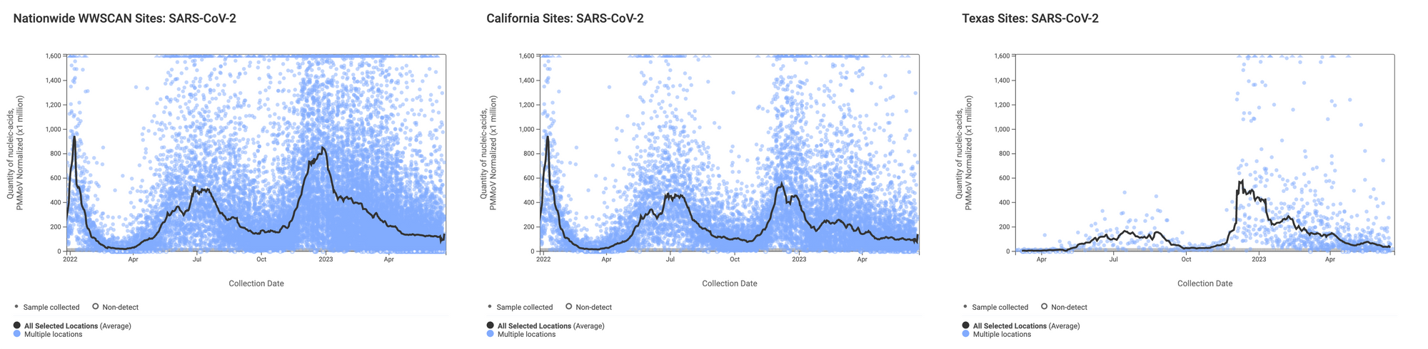 SARS-CoV-2 N gene RNA concentrations (normalized by PMMoV) are continuing to decrease overall. The median concentration across all sites over the last 21 days is 36,607 copies/gram. Below are the SARS-CoV-2 N gene concentrations (normalized by PMMoV) from all participating WWSCAN sites across the country (left panel), those in California (middle panel), and those in Texas (right panel). Evident in the data are relatively high concentrations around the start of the year with lower levels presently observed.