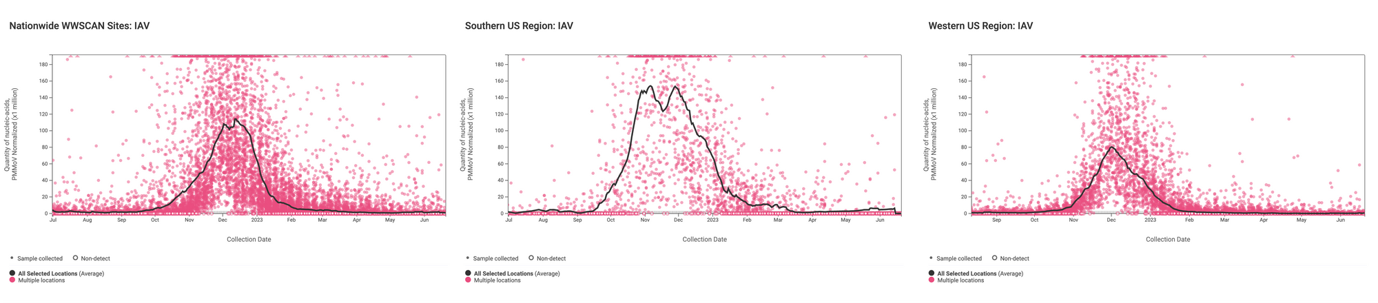 Influenza A (IAV) RNA concentrations (normalized by PMMoV) are very low signaling the end of influenza season. The median concentration across all sites over the last 21 days is 0 copies/gram (non-detect). Examples below are from all participating sites across the nation (left panel), Southern US Census Region, and Western US Censure Region (right panel).