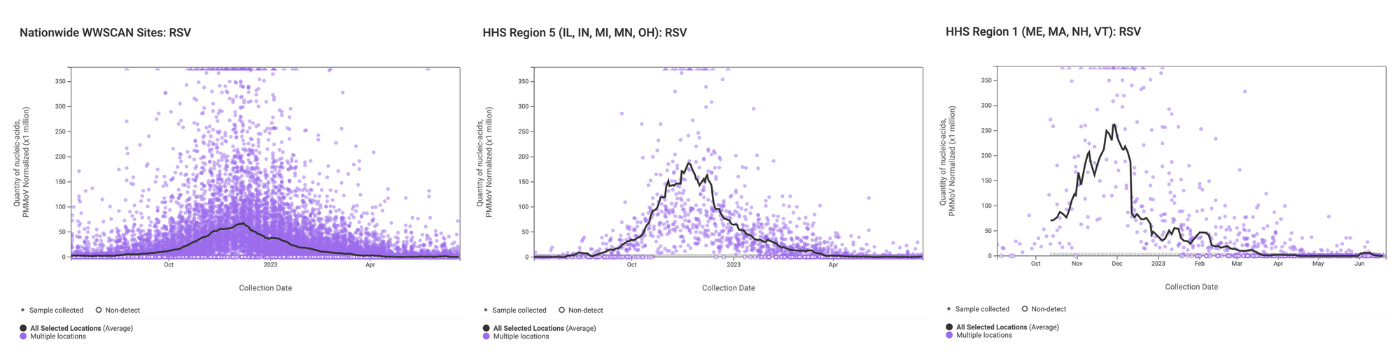 RSV RNA concentrations are low signaling the end of RSV season. The median concentration across all sites over the last 21 days is 0 copies/gram. Example charts below are from all participating sites across the country (left panel), sites in HHS Region 5 - IL, IN, MI, MN, OH, WI (middle panel), and sites in HHS Region 1 -ME, MA, NH, VT (right panel).