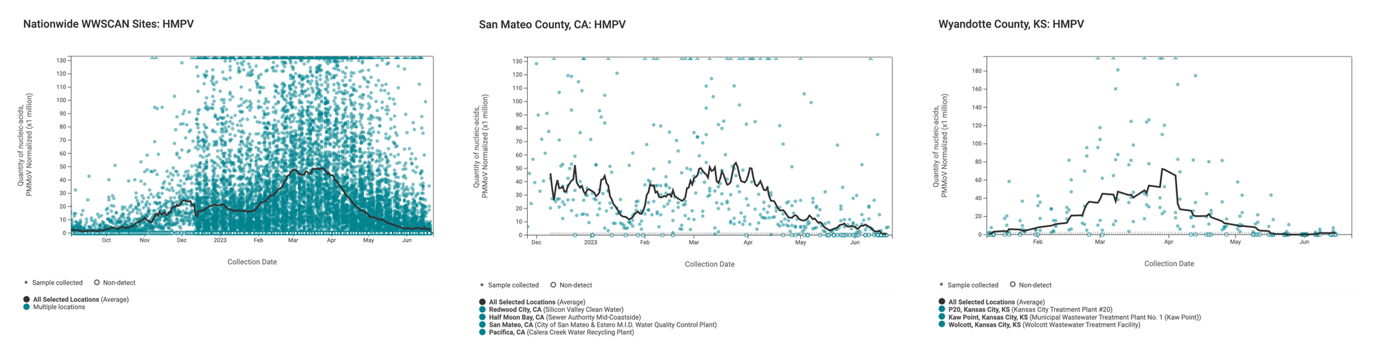 HMPV (Human metapneumovirus) RNA is detected at WWSCAN sites, unlike RSV and Influenza A RNA, but at much lower levels than earlier this year. The median concentration across all sites over the last 21 days is 0 copies/gram, which is about twice our lower limit of detection. Examples below show HMPV RNA at participating sites across the country (left panel), San Mateo County, CA (middle panel), and Wyandotte County, KS (right panel). The weighted average lines in these plots appear to beA trending down.